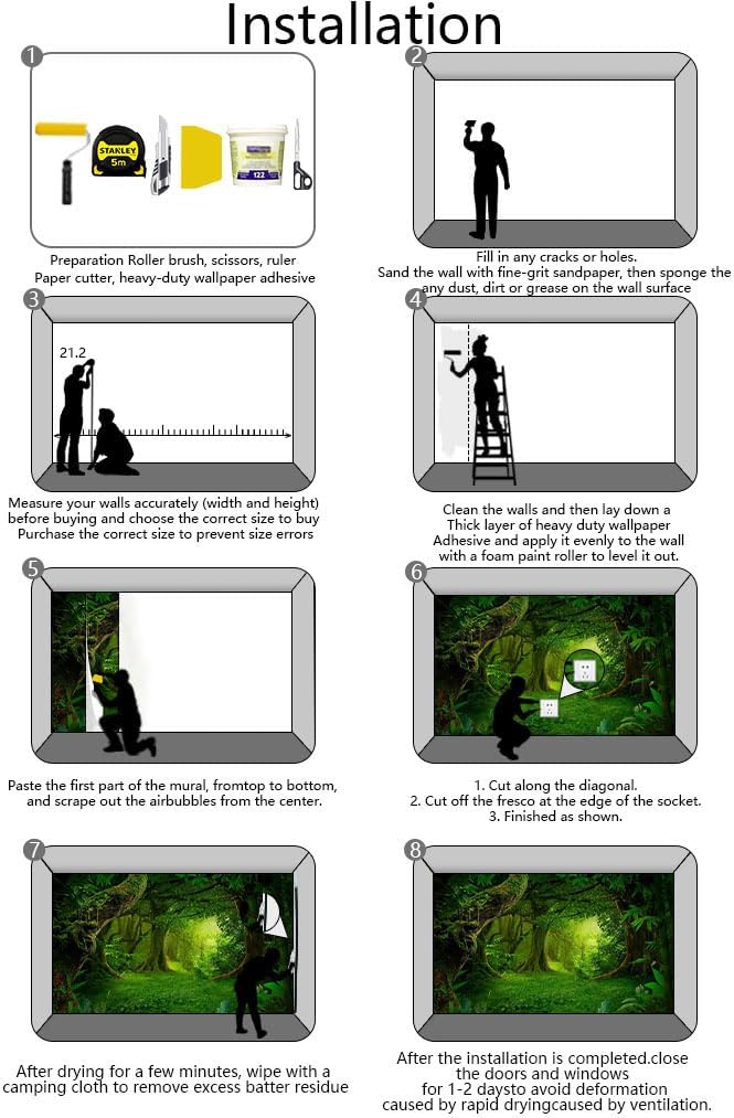 • Installation steps 1. Fill in any cracks or holes and clean the surface of the wall of dust, dirt and grease.2. Apply heavy-duty wallpaper paste to the wall, not the mural.3. Mark the position of each strip of wallpaper with a spirit level.4. Align the pattern and slide it into place.5. Scrape the bubbles with a spatula.6. Let it dry for a couple of minutes and it's ready to go!