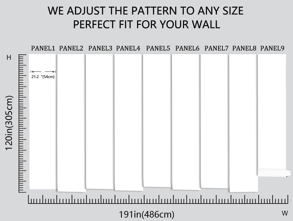 • Our mural is 120 inches tall and 191 inches wide, and to make it easier to transport over long distances, we have divided the width into 9 panels of 21.2 inches each, with a numerical serial number under each section to make installation easier!