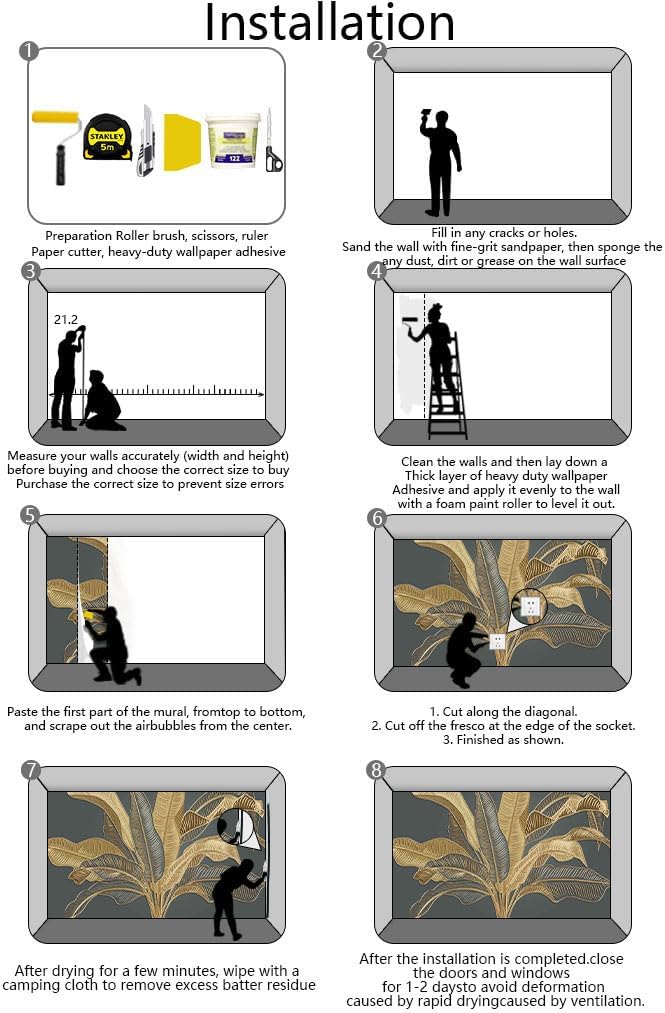 • Installation steps 1. Fill in any cracks or holes and clean the surface of the wall of dust, dirt and grease.2. Apply heavy-duty wallpaper paste to the wall, not the mural.3. Mark the position of each strip of wallpaper with a spirit level.4. Align the pattern and slide it into place.5. Scrape the bubbles with a spatula.6. Let it dry for a couple of minutes and it's ready to go!