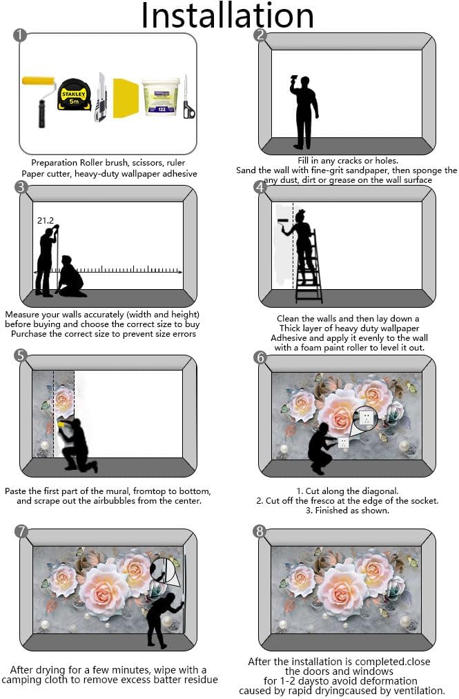 • Installation steps 1. Fill in any cracks or holes and clean the surface of the wall of dust, dirt and grease.2. Apply heavy-duty wallpaper paste to the wall, not the mural.3. Mark the position of each strip of wallpaper with a spirit level.4. Align the pattern and slide it into place.5. Scrape the bubbles with a spatula.6. Let it dry for a couple of minutes and it's ready to go!