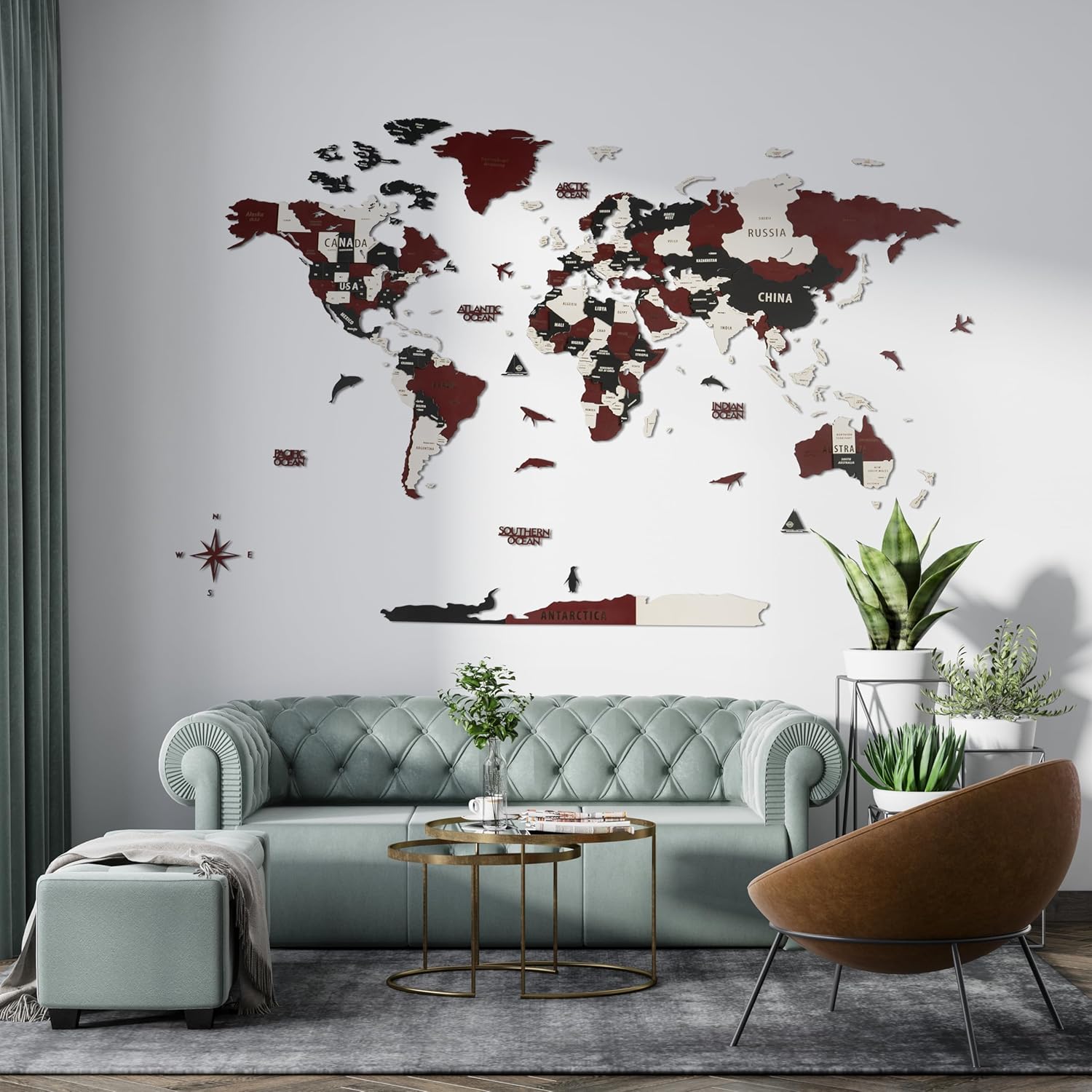 Colorfull Worlds 3D Wooden World Wall Art | Unique Wall Decor with Pins for Travel Enthusiasts | Home and Office Wall Décor | Burgundy | XLarge