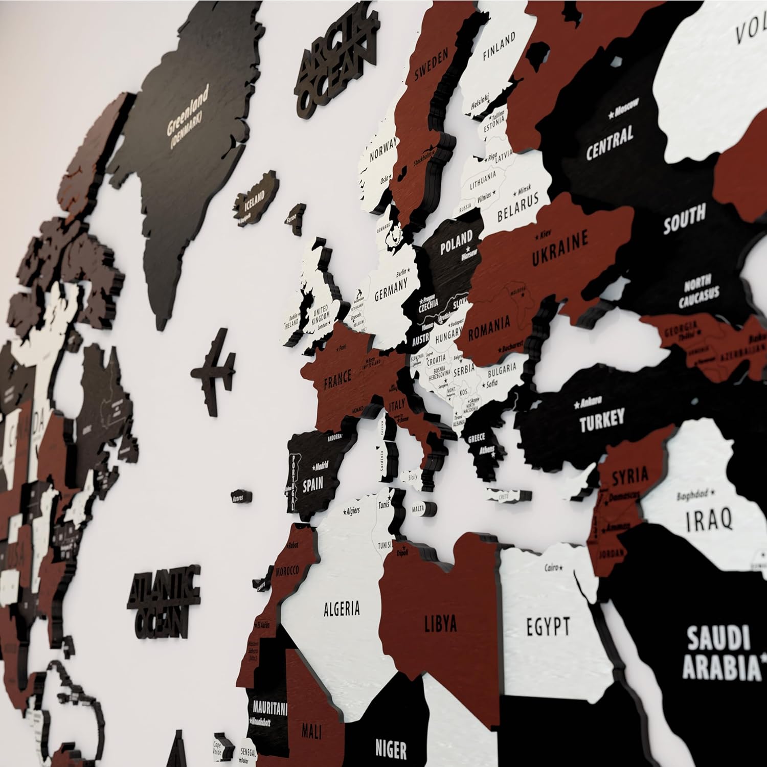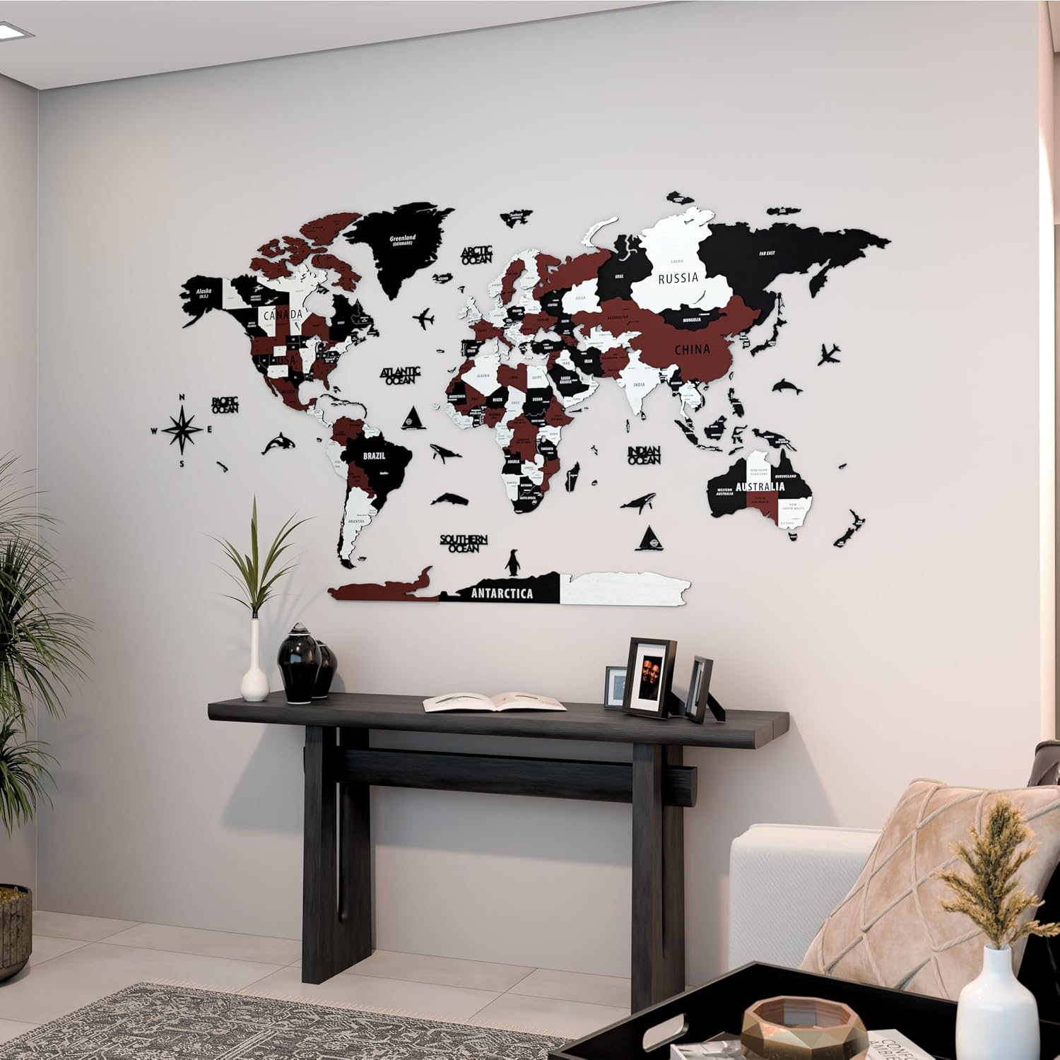 Colorfull Worlds 3D Wooden World Map Wall Art | Unique Wall Decor with Pins for Travel Enthusiasts | Home and Office Wall Décor | Burgundy | XXLarge