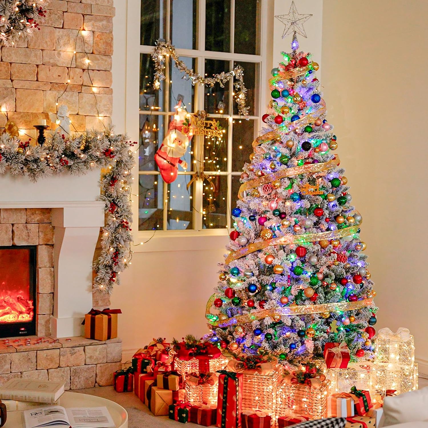 • PRE-LIT CHRISTMAS TREE: The 7.5ft snow flocked Christmas tree add a mesmerized festive atmosphere to your home by changing 450 pre-strung lights from warm white to multicolor with the touch of a button. The bulbs are UL certificed, safely designed to remain lit even if one burns out. Included is a foot pedal switch to control 10 different light colors and actions.