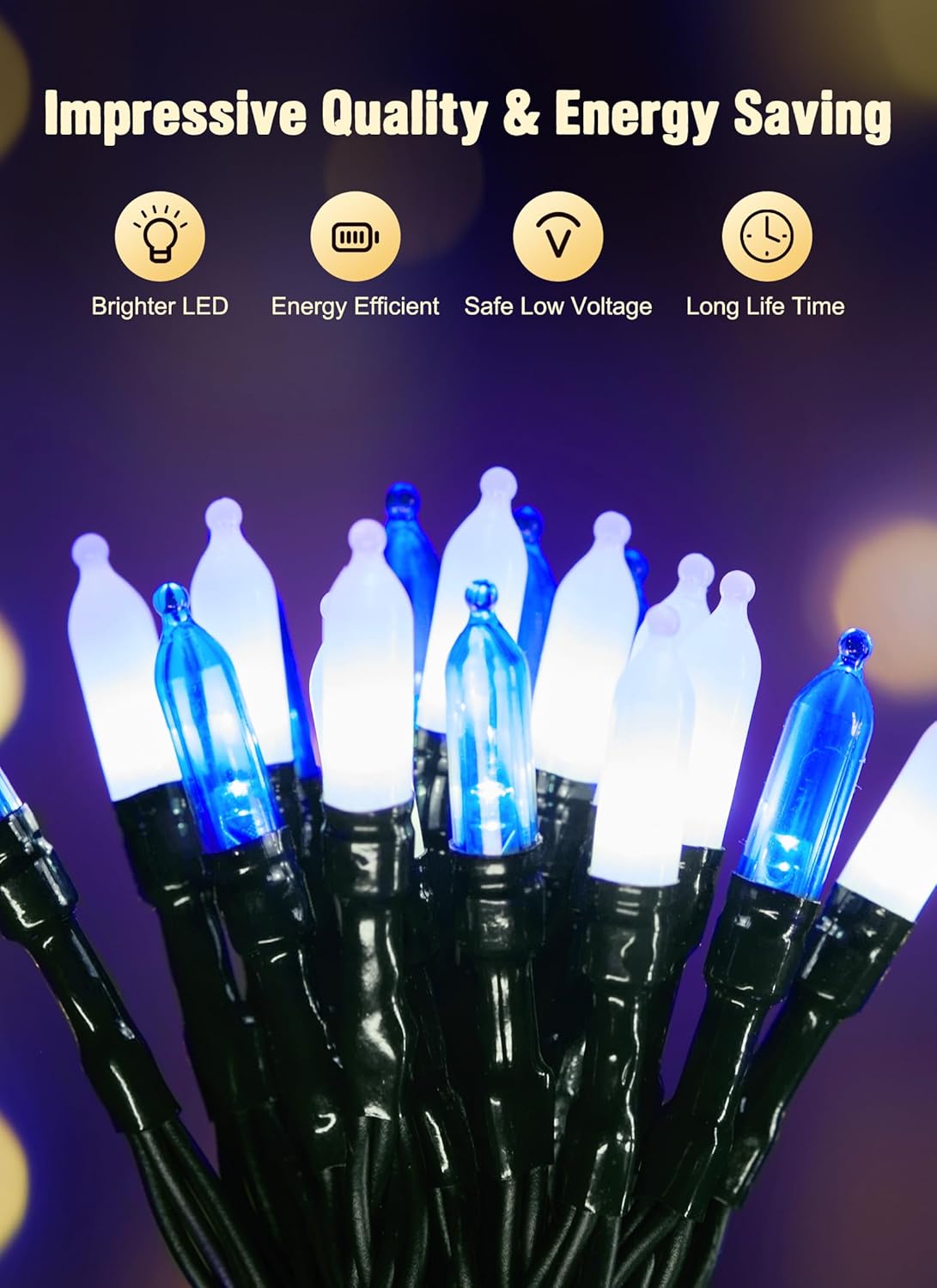 • Indoor Christmas Lights : 20 super bright blue & white color LEDs lights on 8 Ft. long wire with 4 inches distance between LED bulbs and 20 inches clear cable between wire and battery box
