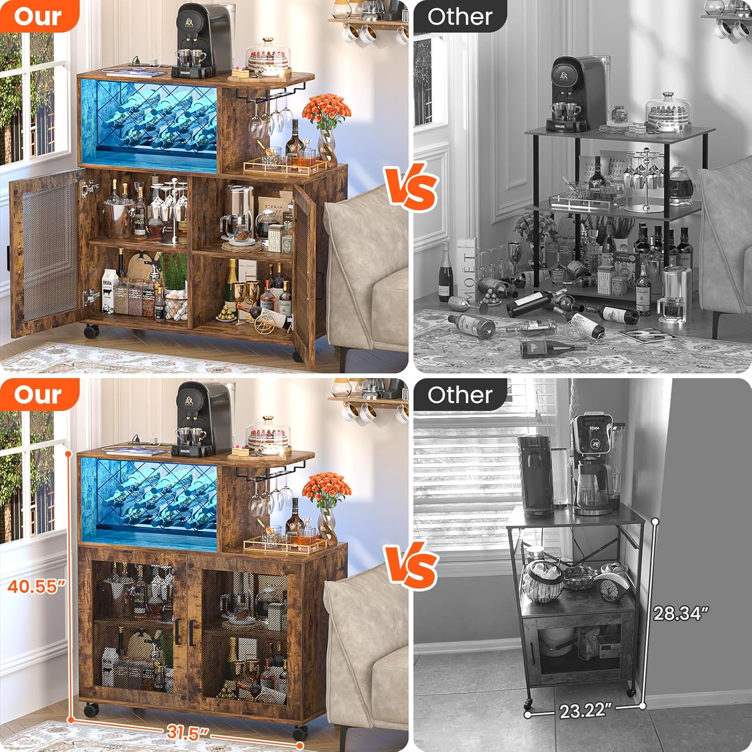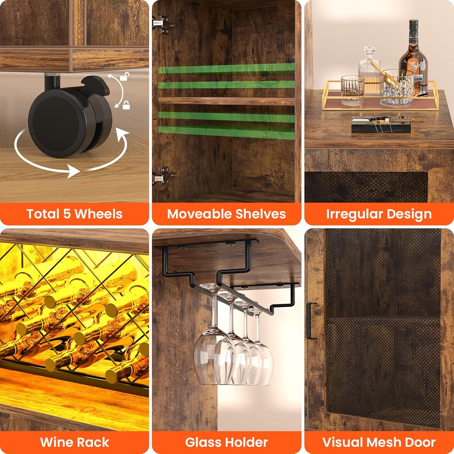 • 🍾Small Wine Bar Cabinet: Compared to other bar cabinets with a height of 28.34 ", the Girapow small bar cabinet with a height of 40.55" is ideal for placing next to the sofa as a coffee bar cabinet or as a mini home bar in the living room. There are a total of 5 wheels at the bottom, which improves stability while making it easier to move the cabinet.