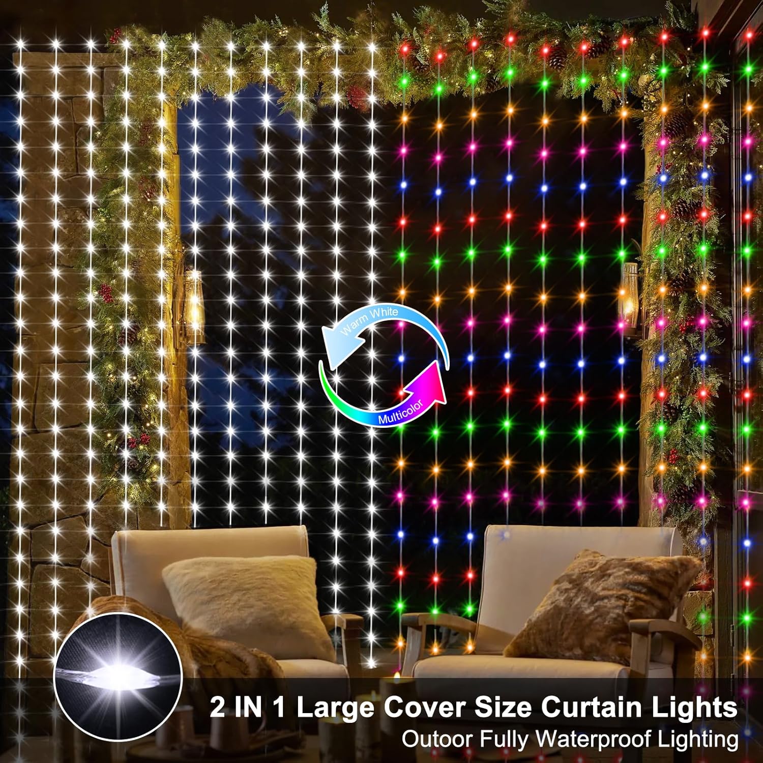 • 2 Color Changing Curtain Lights: 20ft x 10ft 600 LED curtain lights feature a dual-color design, can be switched to cool white & multicolor, provide a stunning and magical display. Perfect for windows, walls, or any area that needs a touch of sparkle