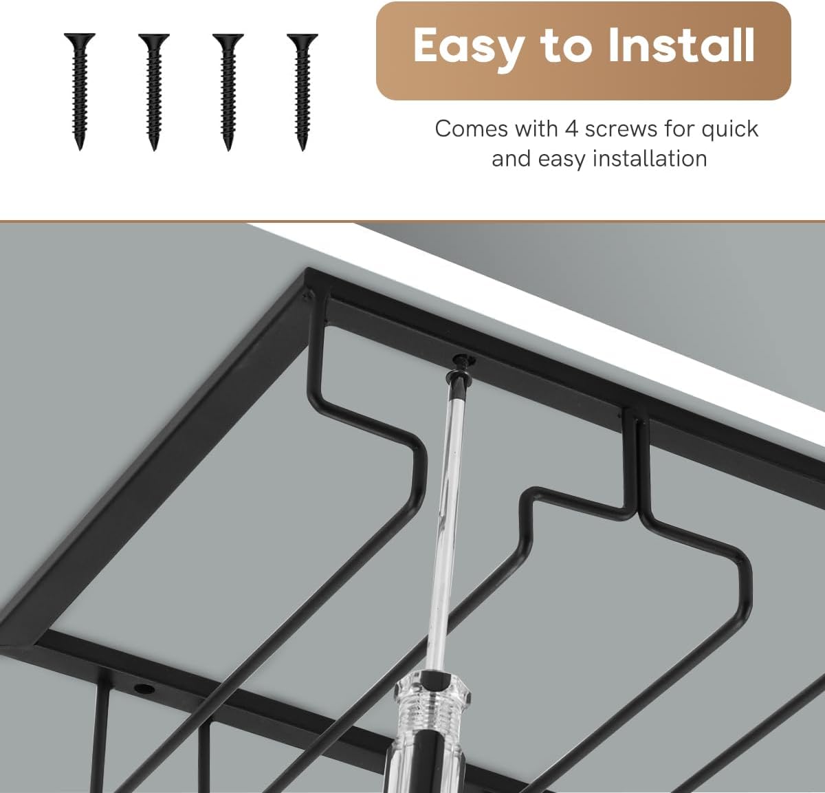 • [Easy to install] - This wine glass hanging rack comes with pre-drilled mounting holes and the screws needed.This rack just takes you a few minutes to assemble and it is easy .What you need to do is using a screwdriver to tighten the screws into the bottom of the wooden cabinet.Ideal for DIY making a wine bar at home or kitchen.