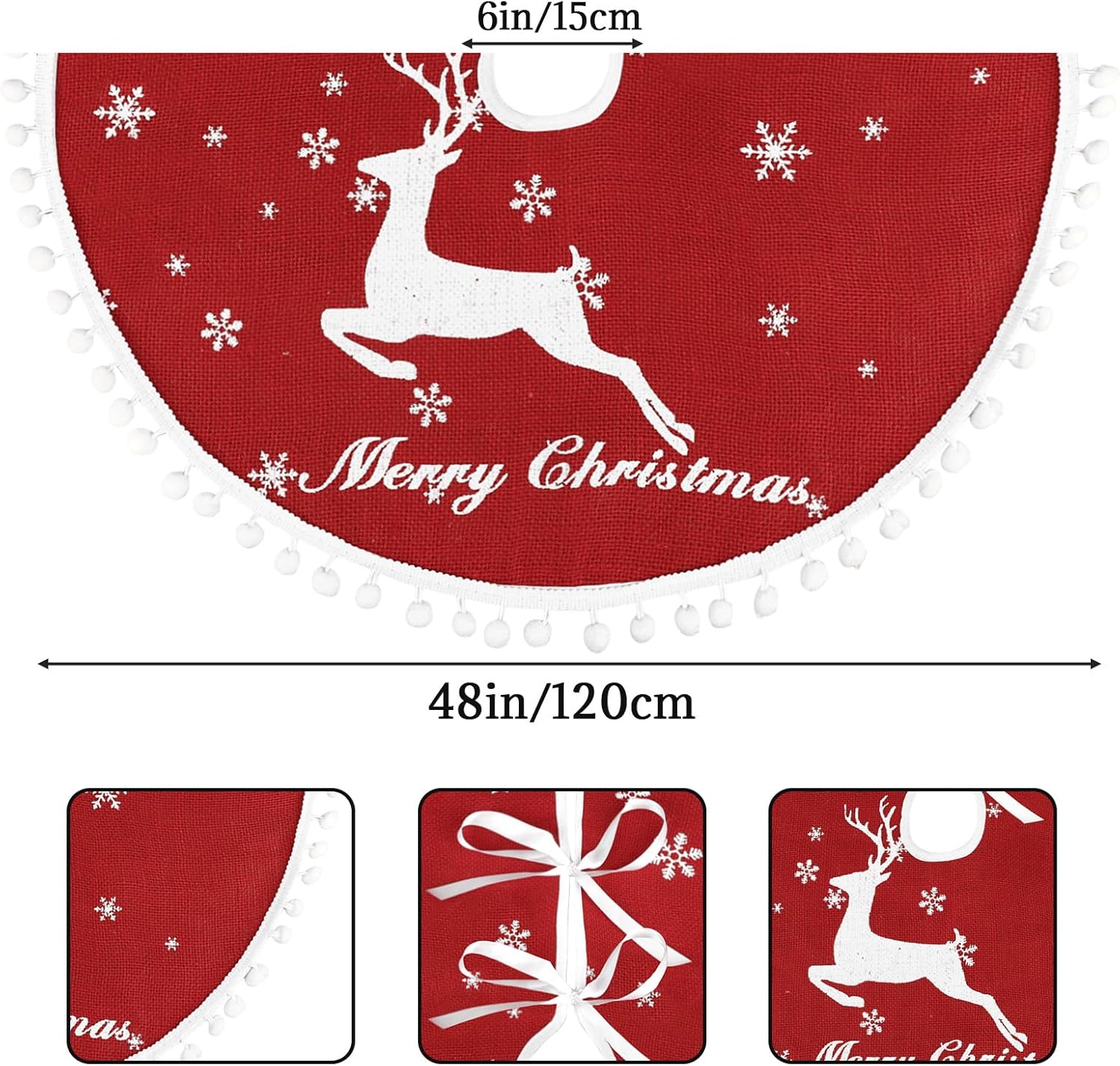 • Burlap Material Tree Skirt:This rustic Christmas skirt tree is made from natural burlap. The color has been safely treated to present a classic Christmas red. This fabric makes the xmas tree skirt tough, durable, and environmentally friendly, and it will not pill. The tree skirt can be reused in subsequent years