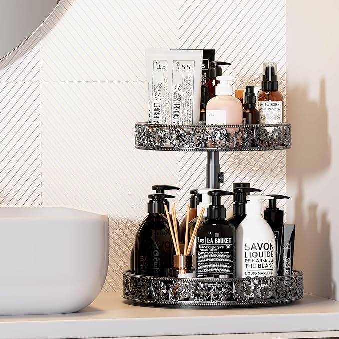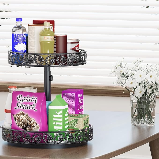 • 【Design with Floral Raised Edges and Open】The lazy susan for cabinet heightened edge with beautiful classic flower design not only provides exceptional decorative visual, but also prevents items from falling when rotating, it's safer to move the 2 tier lazy susan organizer tray from one place to another.The open design of turntable organizer makes items clearly visible and easy to access and use.