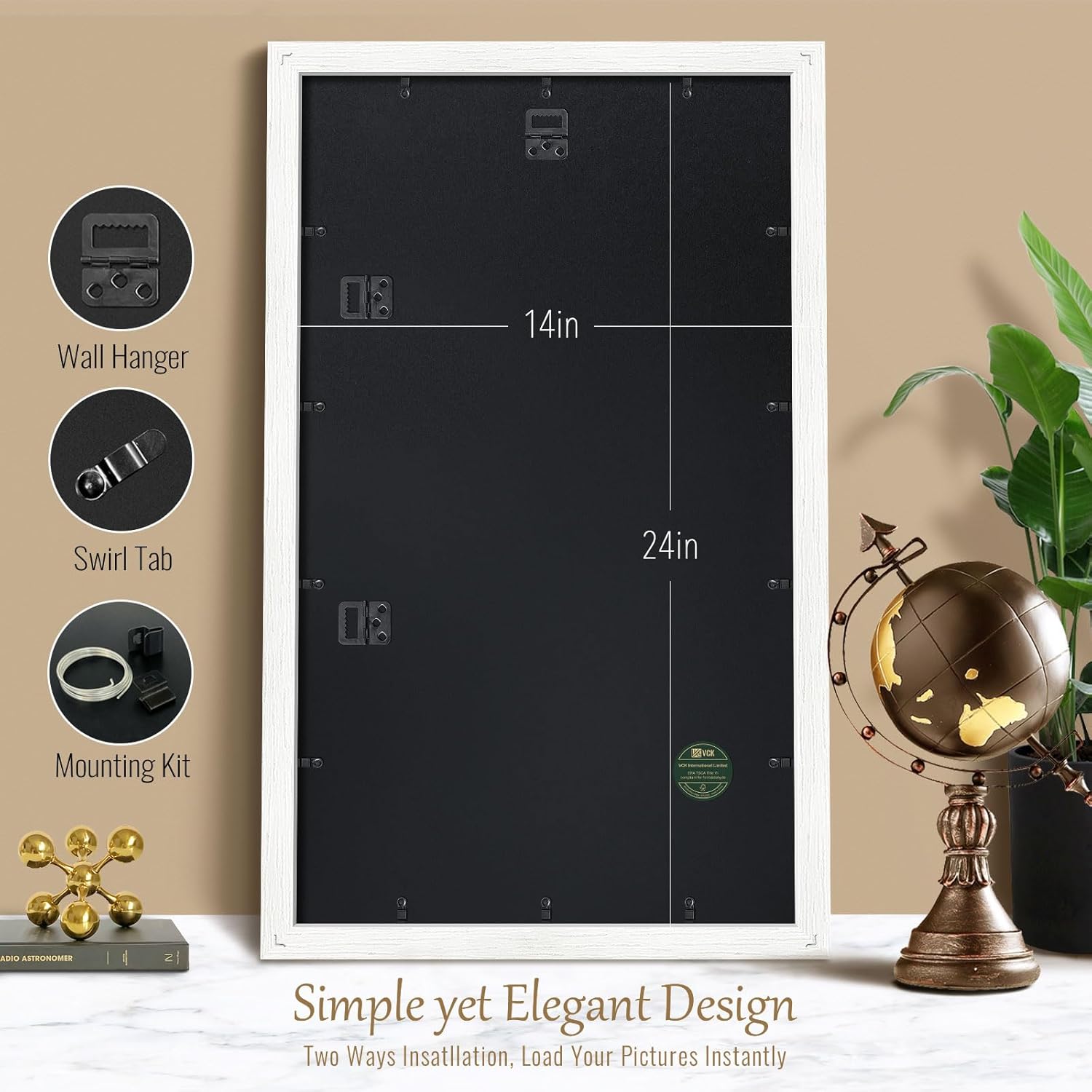 • PRODUCT FEATURES: The overall size is 15.8”x25.8” for Pictures 14x24 or 24x14, horizontal/vertical for table or wall display. Unlike others, special swirl tabs make the frame super easy to load pictures.