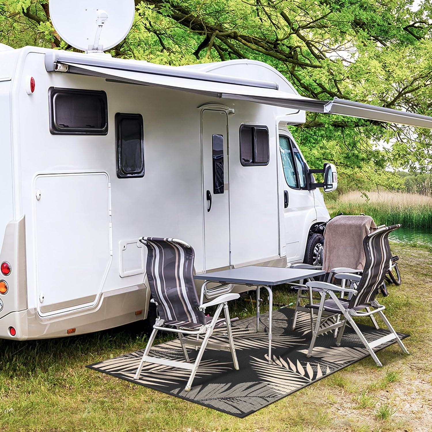• Perfect Choice For RV Camping: Woven from lightweight plastic straws, these RV outdoor rugs fold compactly to fit in the included carry bag. This portable waterproof outdoor rug is easy to carry, with 4 corner loops and stakes to secure it. Using this camper rug reduces travel fatigue and adds plenty of space for fun — also a stylish touch for fall decor when setting up your campsite