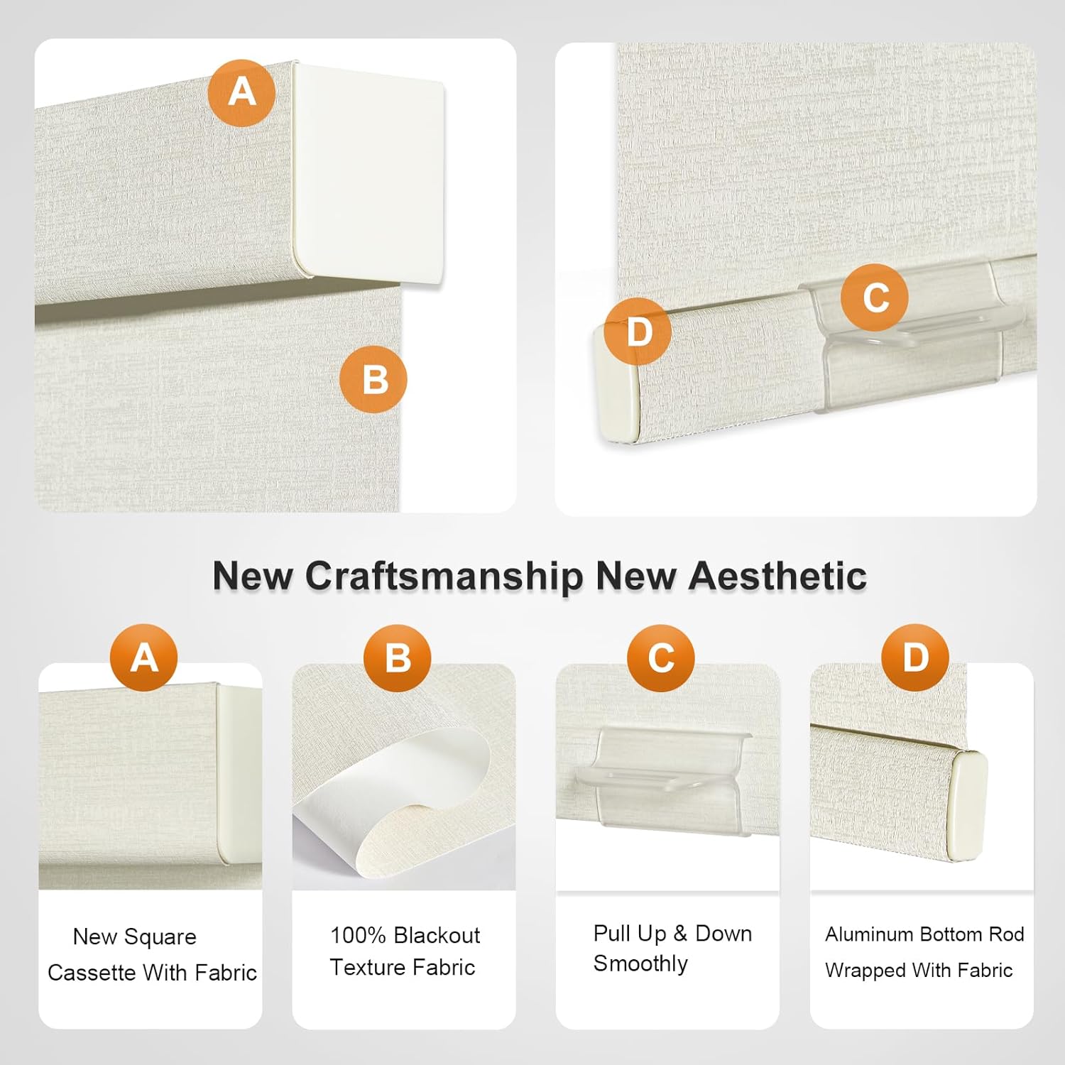 • [FEATURES]: Cordless window blinds with Free Stop & Single jacquard roller features. Enjoy Clean looking & Child Safety with Cordless Pull down shades for windows. A handle at the bottom bar enables you to stop the shade at any state you want. Polyester imported, blackout, suitable for any room that needs blackout function, good ventilation. Easy for installation.