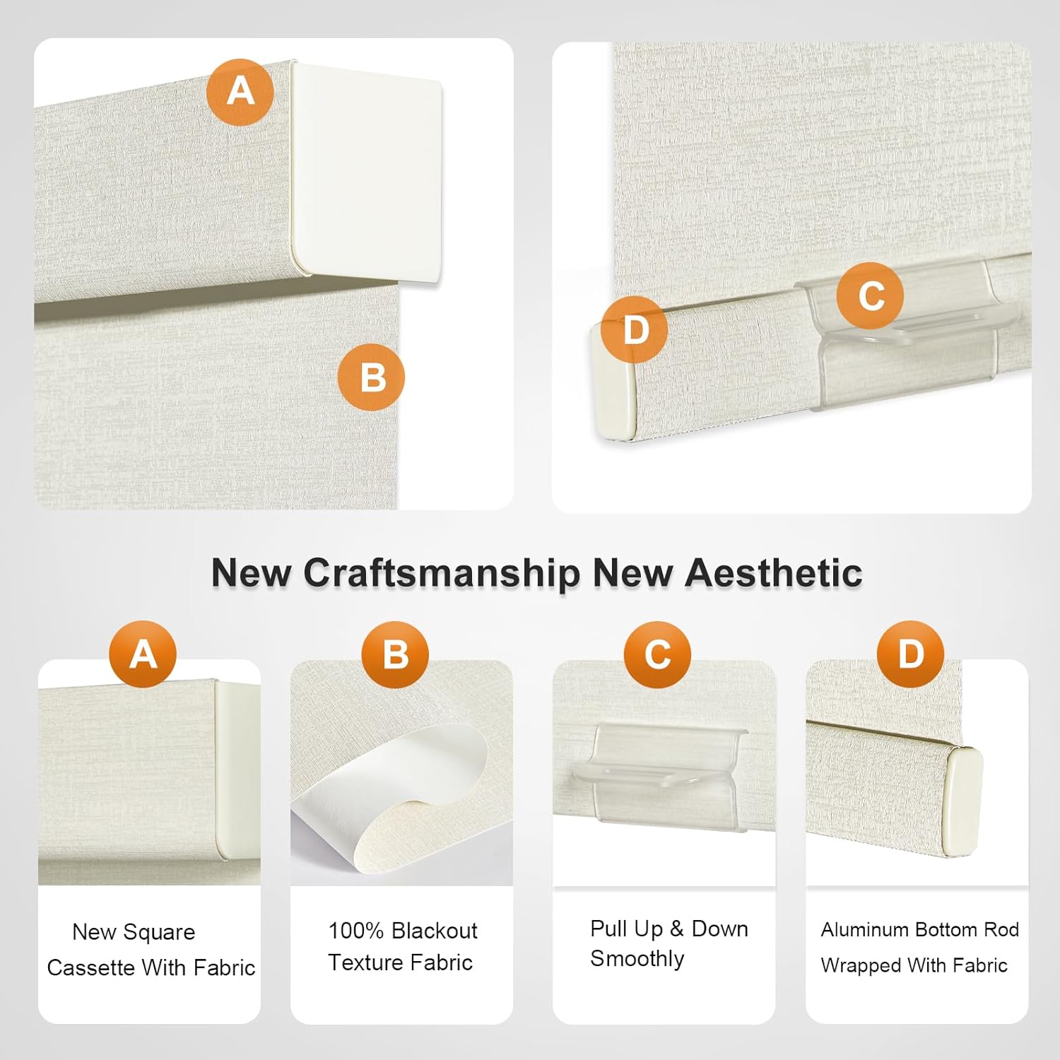 • [FEATURES]: Cordless window blinds with Free Stop & Single jacquard roller features. Enjoy Clean looking & Child Safety with Cordless Pull down shades for windows. A handle at the bottom bar enables you to stop the shade at any state you want. Polyester imported, blackout, suitable for any room that needs blackout function, good ventilation. Easy for installation.
