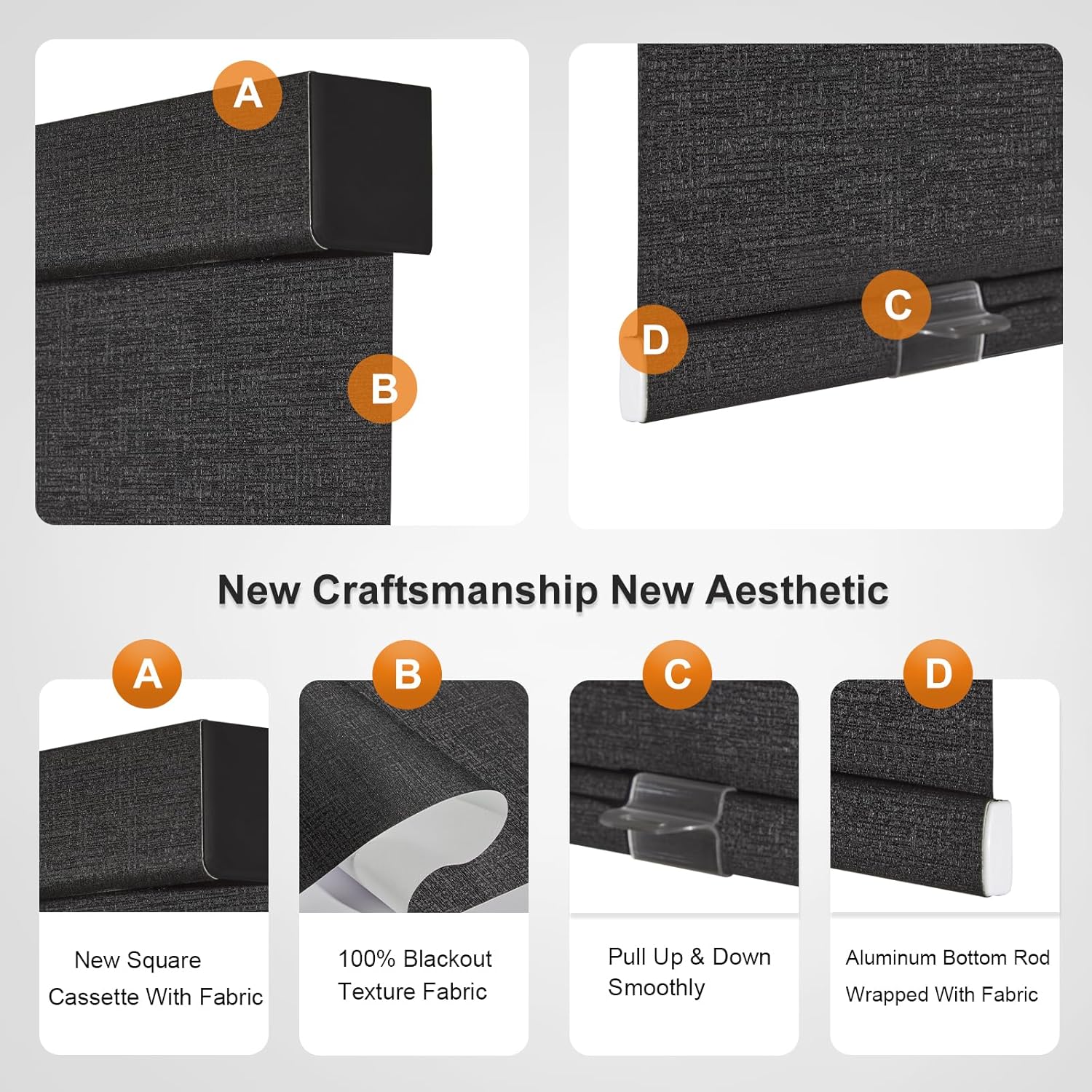Persilux Free-Stop Cordless Blinds for Indoor Windows with Cover, Window Shades Blackout Roller Blinds, Thermal Insulated Fabric UV Protection for Kitchen, Office, Living Room, Black(64" W x 48" H)