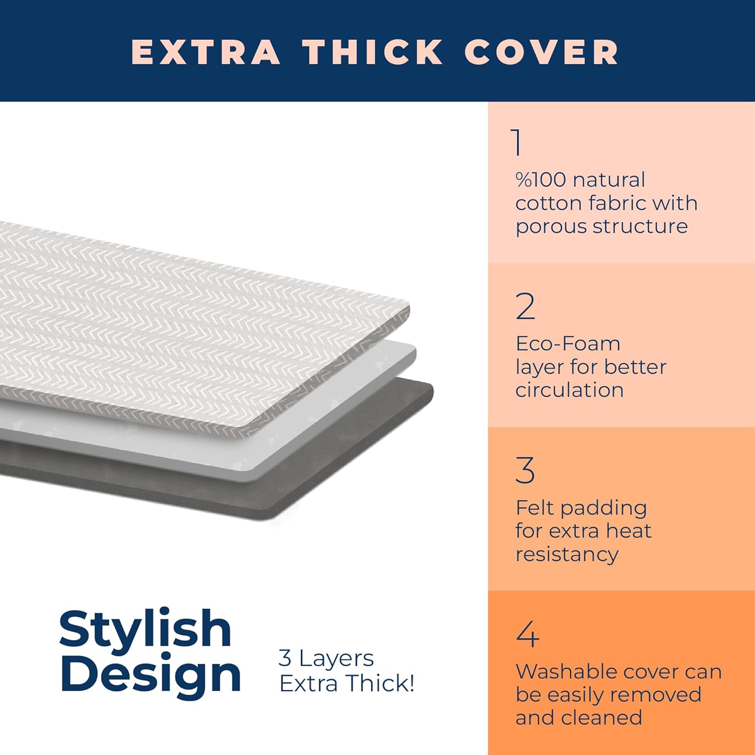 • EXTRA THICK PADDING FOR REMARKABLE DURABILITY: Heavy-duty padding and %100 cotton surface provides exceptional durability to ironing board cover. Top layer is extremely scorch and stain resistant cotton fabric. Happhom cover is specially designed to meet a contemporary taste. Our cover with exclusive patterns and design is a great fit to family d‚cor.