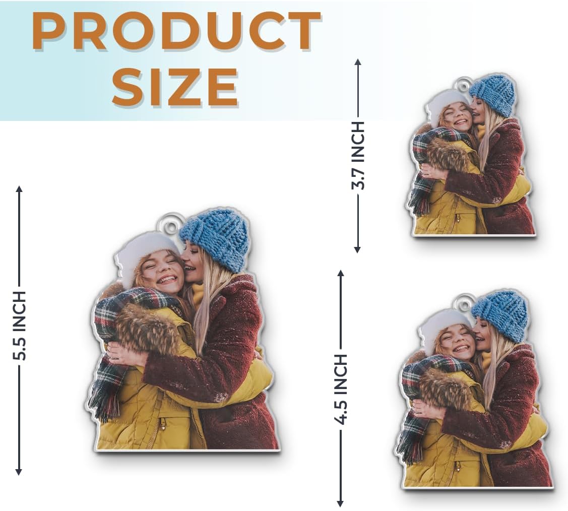 • 🎄 Custom Ornaments With Pictures: Crafted with high-quality acrylic, this ornament features a height of 3.7 inches (~9.5 cm) and a slim 0.12" thickness, ensuring its durability and lightweight design. The ornament can be customized with your photo, which makes it a truly personal and cherished gift. We include a hanging gold cord loop to easily hang on your Christmas tree or an ornament stand.