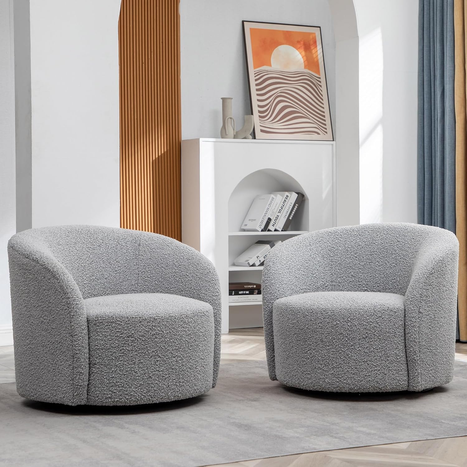 • 34-IN WIDENED BARREL CHAIRS - It's different than the tiny 25.6-inch barrel chair size on the market. KINWELL boucle swivel barrel chair overall size: 32.7'' D X 34'' W X 28.5'' H. Weight: 49.3 lbs. With a seat size of 16.9'' H X 22'' W X 23.6'' D. The space is comfortable enough for an adult to read or rest. Set of 2 pack for you and your friends or significant other.