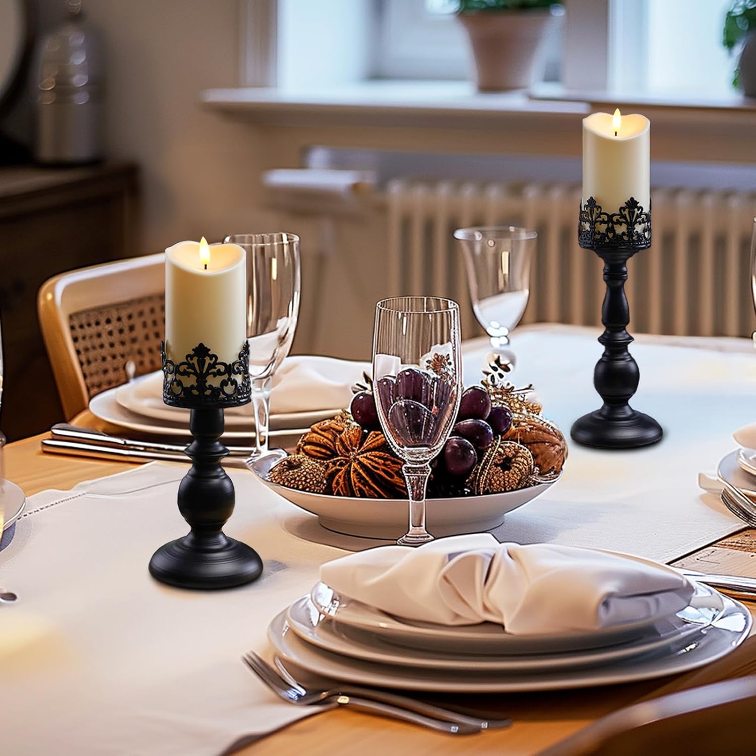 • 【Material】: The pillar candle holder is made of high-quality iron and is light but strong. The surface is black and will last for years. Metal candle holders set of 2 can hold real candles or LED candles.