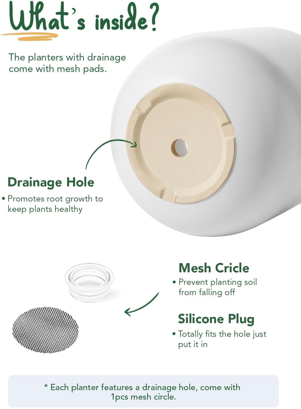 • Drainage Hole & Accessories: Each indoor planter pot features carefully designed drainage hole to maintain optimal soil moisture; The inclusion of silicone plugs and mesh pads provides added convenience, giving you flexibility in how you care for your plants