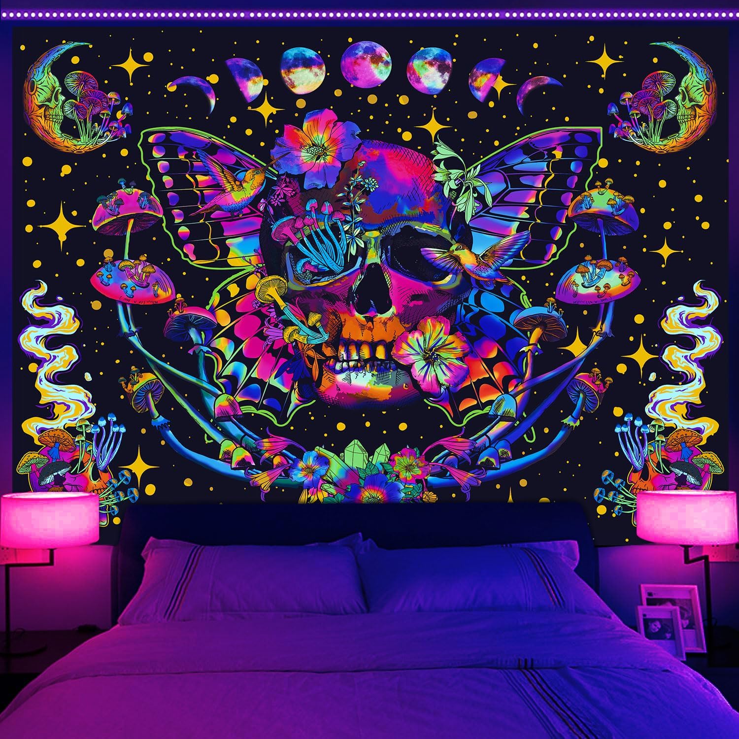 Xiaoput Blacklight Skull Tapestry for Bedroom & Living Room, UV Reactive Mushroom Butterfly & Moth Moon Flowers Tapestry, Hippie Skeleton Wall Hanging 90x70IN