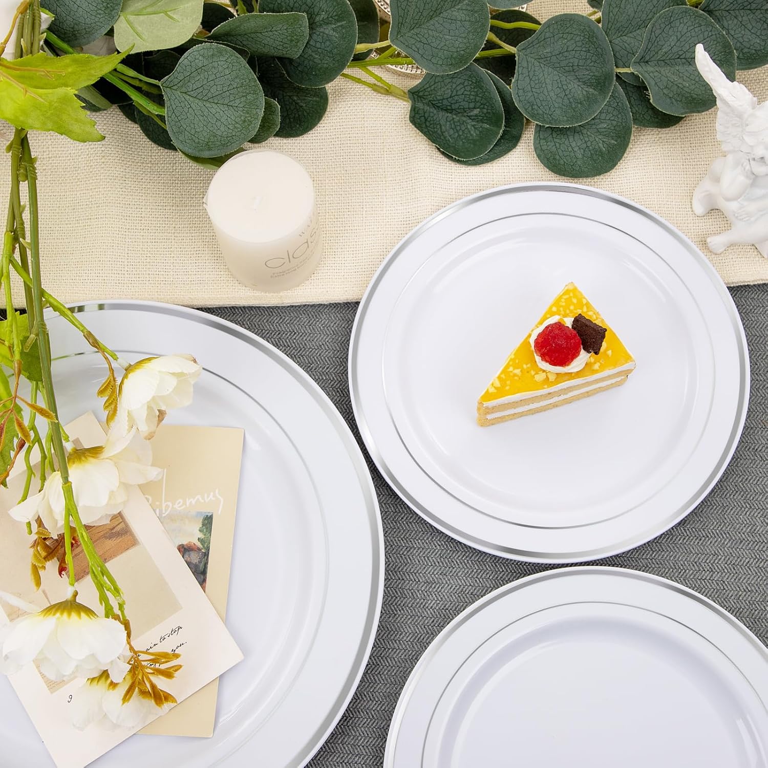 • SPECIAL DESIGN: The white plate set comes with a beautiful silver rim that adds a luxurious touch to your table. These white and silver plastic plates are beautifully designed and will add elegance to your party.