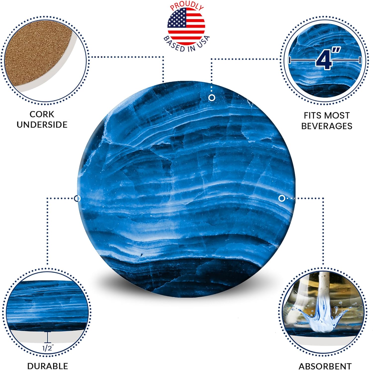 • NON SLIP & EASY CLEAN: The natural marble style coasters are smooth to the touch and measure over 4 inches making it perfect for any beverage cup. Now you can confidently place your wet drinks or super hot beverages on your coffee and dining tables. Simply clean them with a damp cloth and wipe them off within seconds.