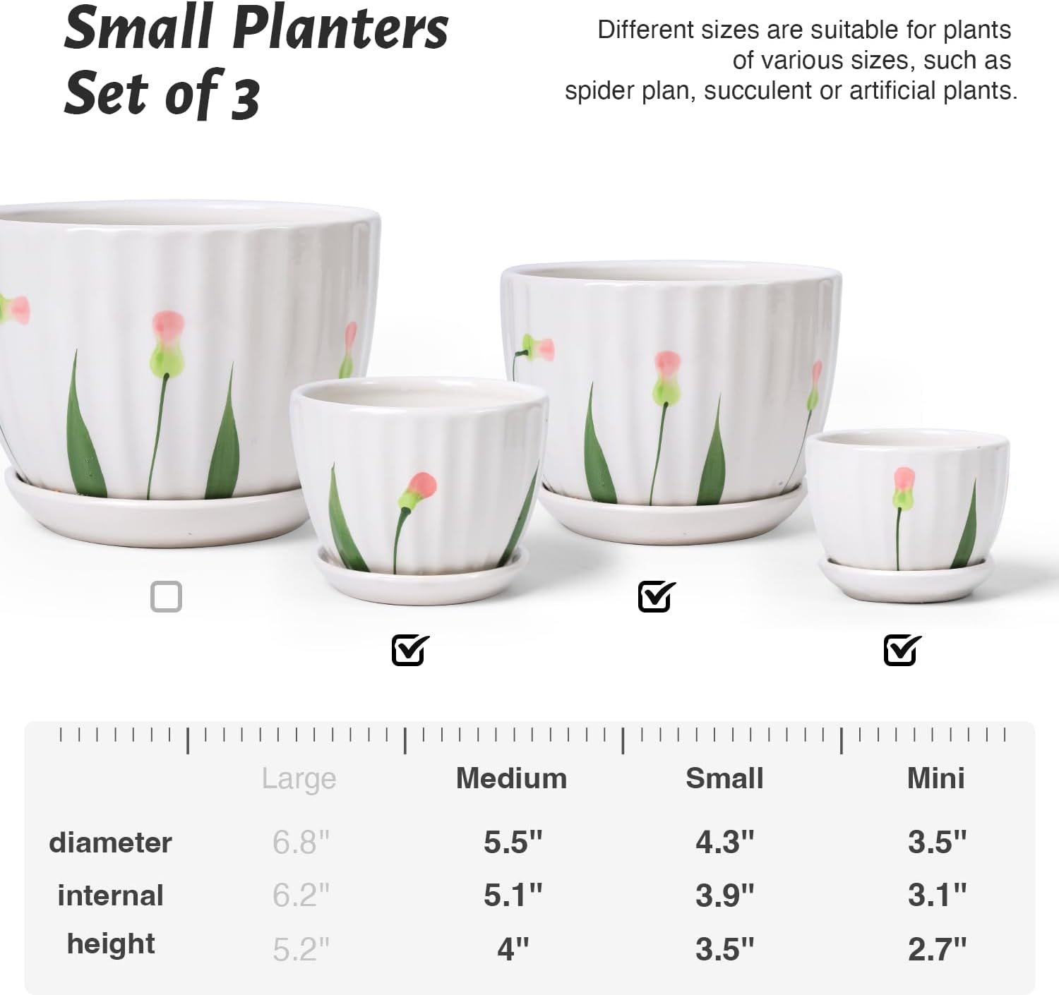 • SMALL PLANTER SET: These garden plant pots are made of ceramic and come in three sizes: Medium width is 5.5 inches (14 cm), Small width is 4.3 (11 cm) inches, and nimi width is 3.3 inches (9 cm). They are fired at high temperature, so they are durable and lightweight.