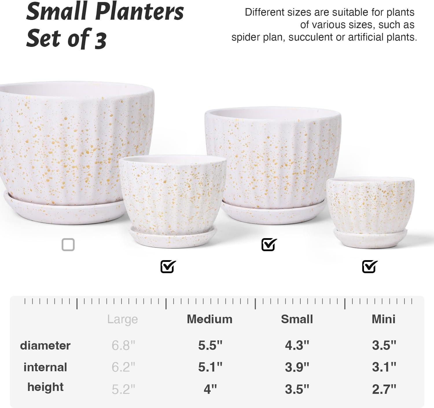 • SMALL PLANTER SET: These garden plant pots are made of ceramic and come in three sizes: Medium width is 5.5 inches (14 cm), Small width is 4.3 (11 cm) inches, and nimi width is 3.3 inches (9 cm). They are fired at high temperature, so they are durable and lightweight.