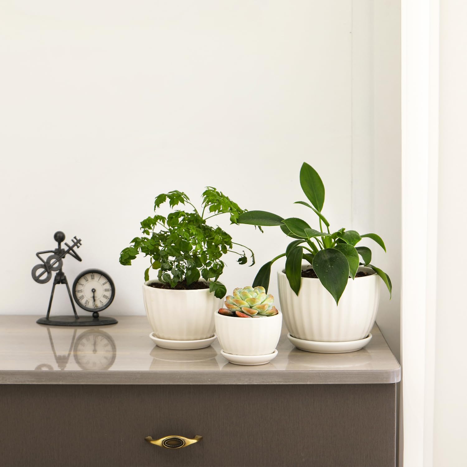 Ceramic Plant Pots with Drainage Holes and Saucers, Round White Flower Pots for Indoor Plant, Diameter 3.3/4.3/5.5 Inches Small Flower Planters Set of 3
