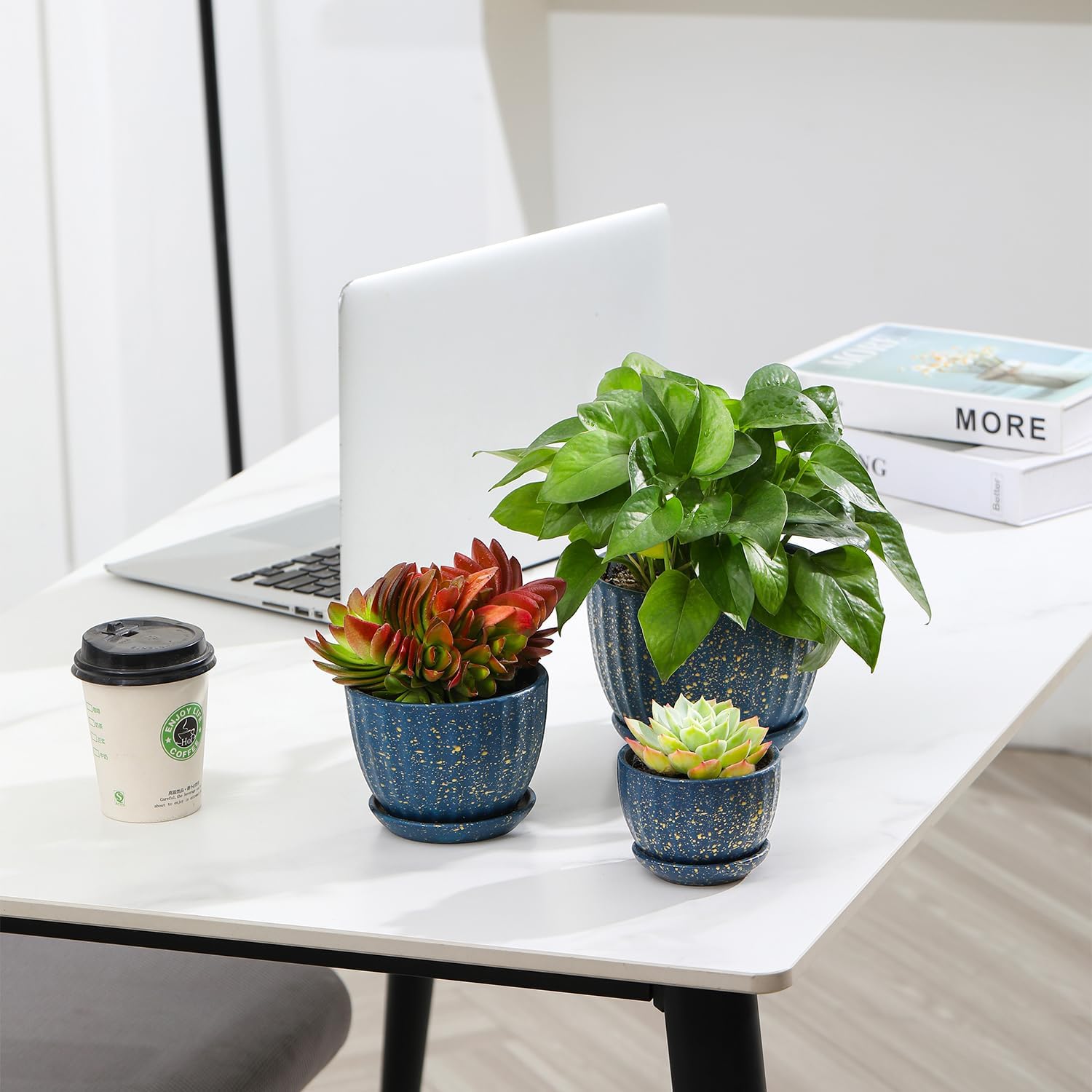 Ceramic Plant Pots with Drainage Holes and Saucers, Round Blue Flower Pots for Indoor Plant, Diameter 3.3/4.3/5.5 Inches Small Mini Flower Planters Set of 3