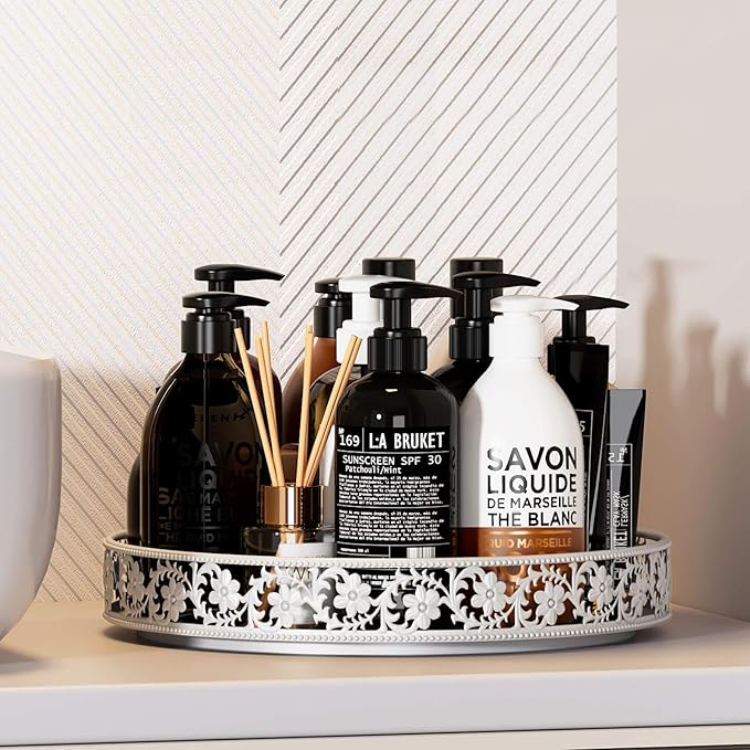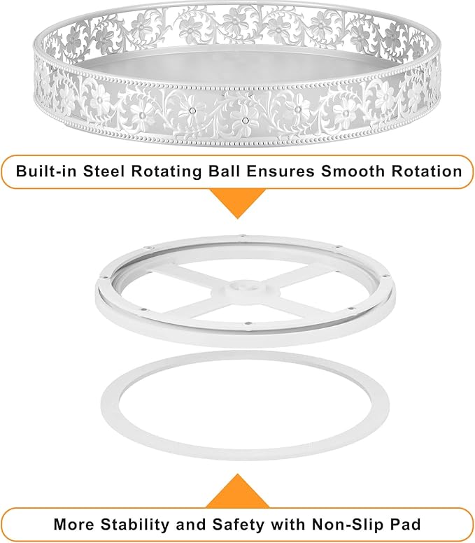 • 【Design with Floral Raised Edges and Open】The lazy susan for cabinet heightened edge with beautiful classic flower design not only provides exceptional decorative visual, but also prevents items from falling when rotating, it's safer to move the lazy susan organizer tray from one place to another.The open design of turntable organizer makes items clearly visible and easy to access and use.