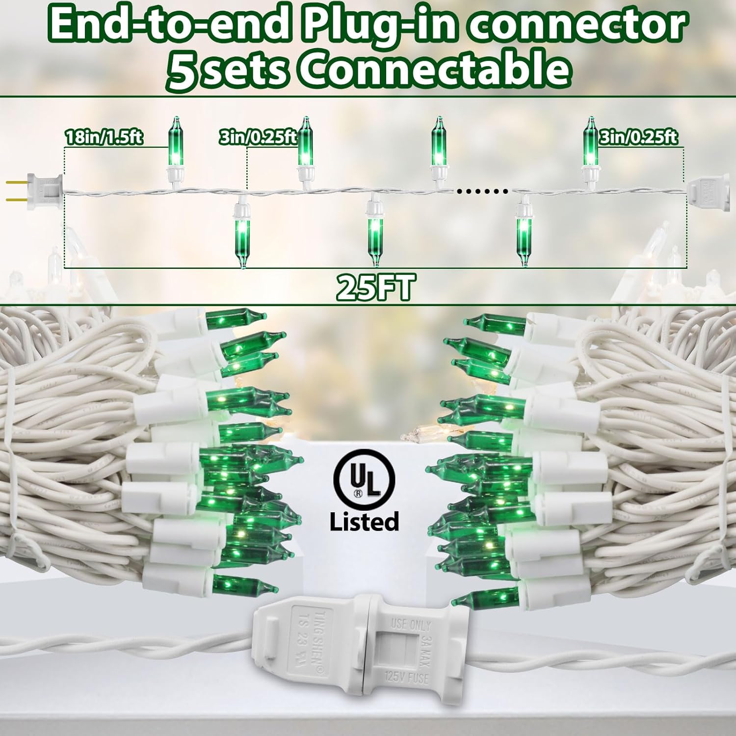 • End-to-End Connectable: 18" Lead Wire, 3" End Connector, 3’’ spacing between bulbs, 0.34 amperes. These green mini string lights can be end-to-end connected, up to 5 sets(125FT 500Lights). You can better dress up your Christmas tree or other places and let the lights expand the lighting range to increase the Christmas atmosphere for your holiday.