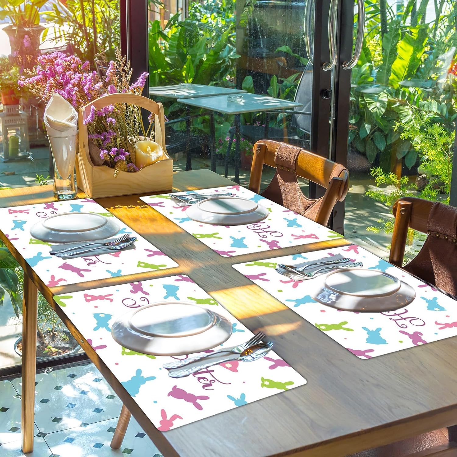 Easter Placemats Set of 6 Easter Rabbit Eggs Plastic Table Mats Easter Bunny Rabbit Place Mats Rustic Vintage Spring Seasonal Table Decoration for Indoor Outdoor Party Kitchen Dining Table