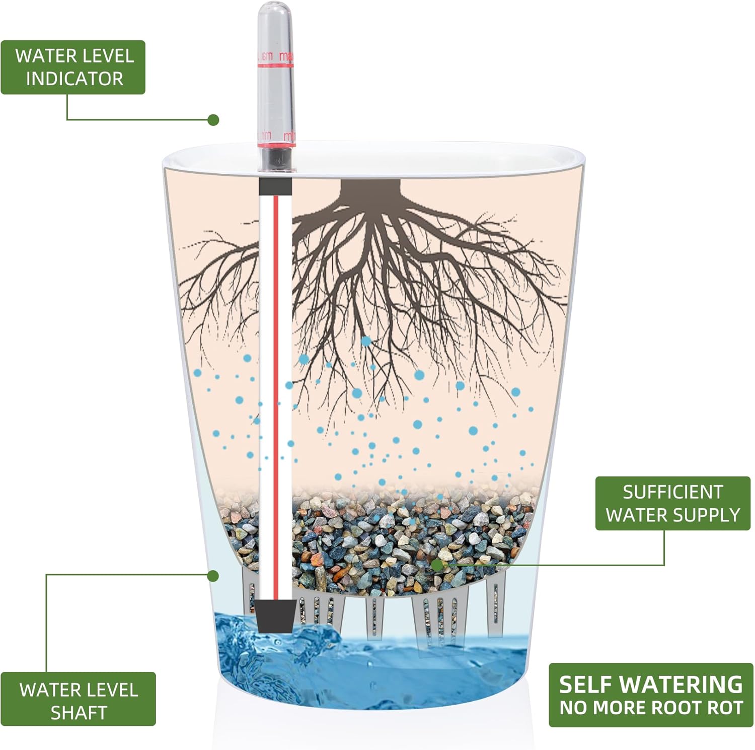 • SELF WATERING & NO MORE ROOT ROT - The smart unique sub-irrigation system is one of the most appealing aspects among all Dexceder planters. The easy-to-use separated integrated water reservoir or catcher- keeps your soil well aerated and automatic supplies plants with the right amount of ongoing moist air & nutrition for optimal growth. The insert indicator shows you the exact time to water again. The full water supply period can single-handedly last over 3 weeks based on different live plants