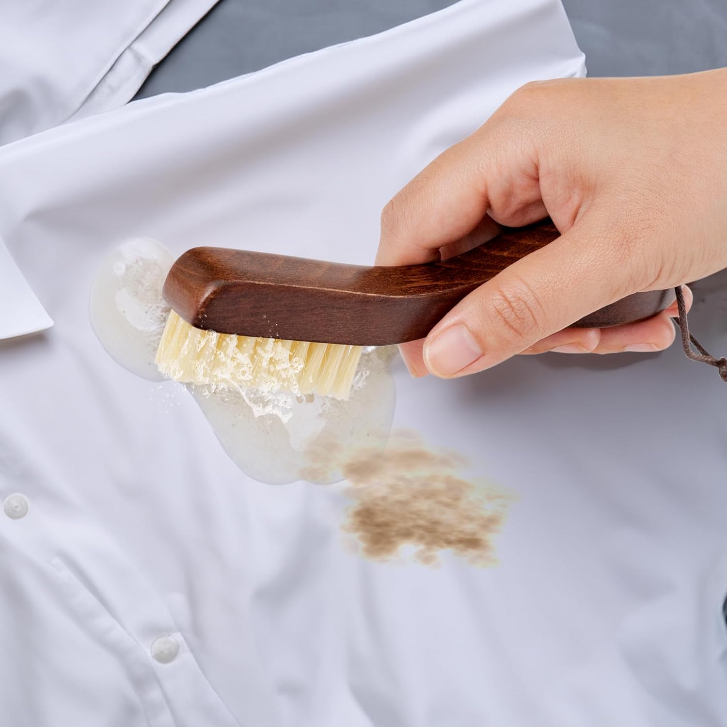 • Soft White Boar Bristles: The boar bristles on this laundry stain brush are relatively stiffer compared to horsehair, making it excellent for removing spots and scrubbing out stains from various fabrics, including cotton, denim, velvet, polyester, nylon, and more. Unlike a stiff toothbrush, the soft white boar bristles won't damage or pill fabrics.