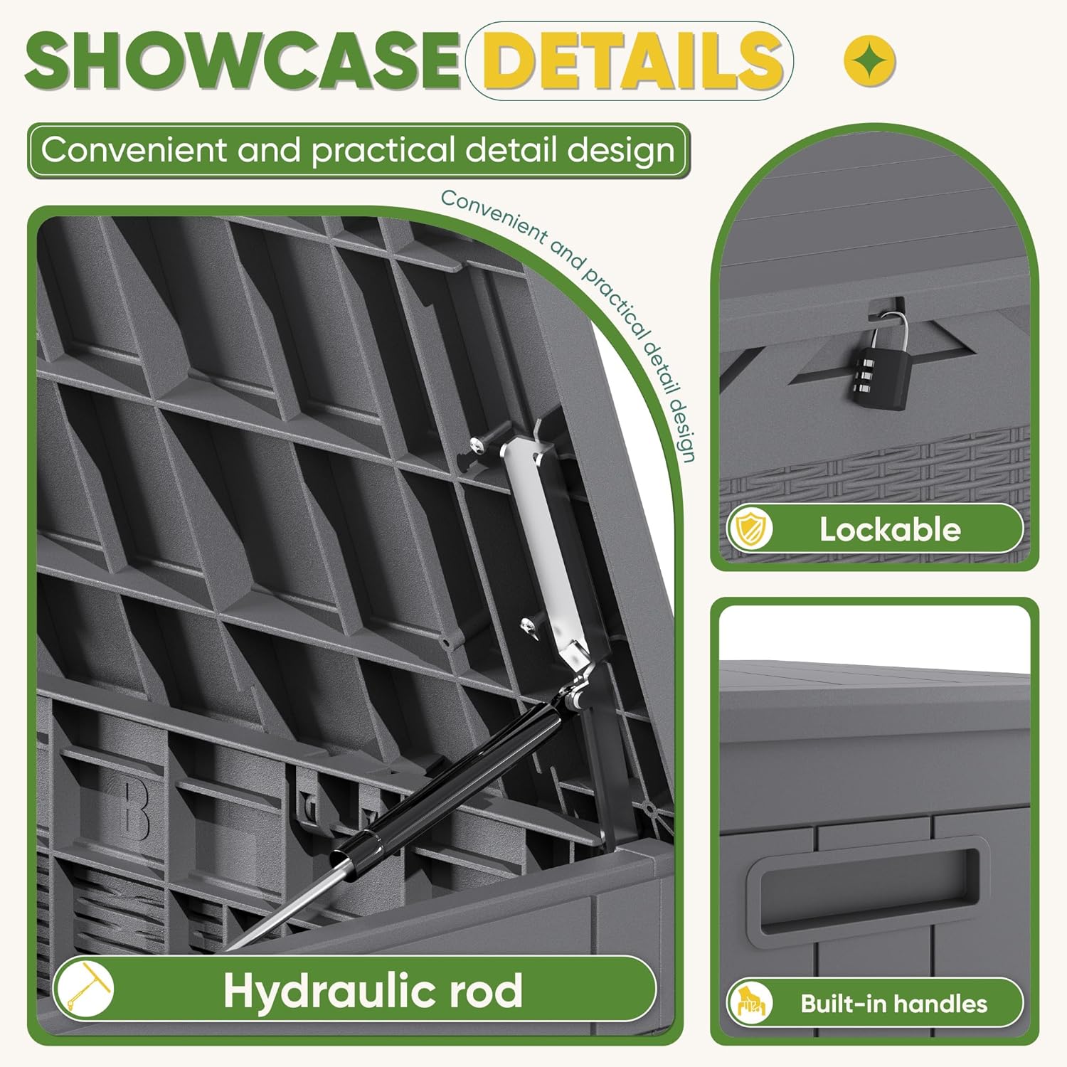 • WIDE VERSATILITY: The 100 gallon storage box can not only help you organize your patio or lawn. It can also be used as a table or bench when you need it, and the lid is equipped with a support bar inside, which can greatly enhance the stability and weight-bearing capacity of the storage box.