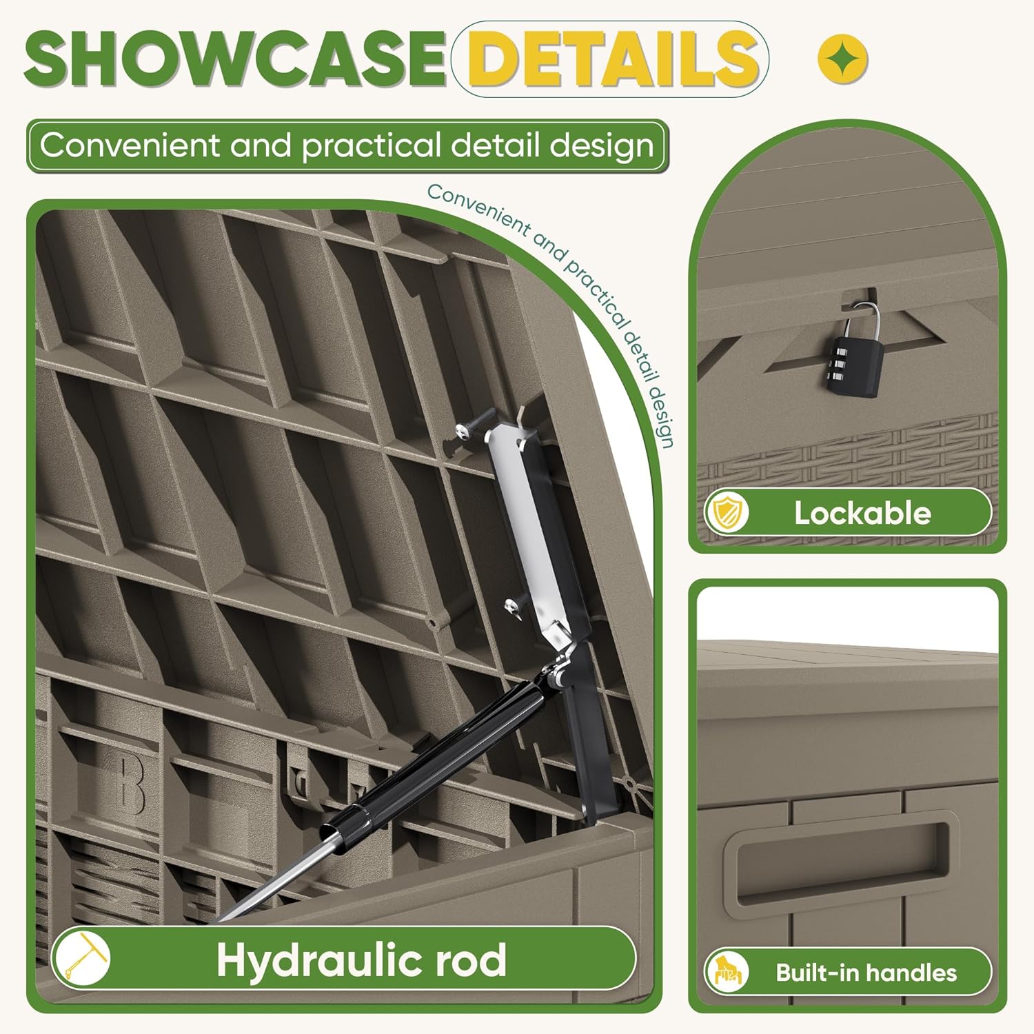 • WIDE VERSATILITY: The 100 gallon storage box can not only help you organize your patio or lawn. It can also be used as a table or bench when you need it, and the lid is equipped with a support bar inside, which can greatly enhance the stability and weight-bearing capacity of the storage box.