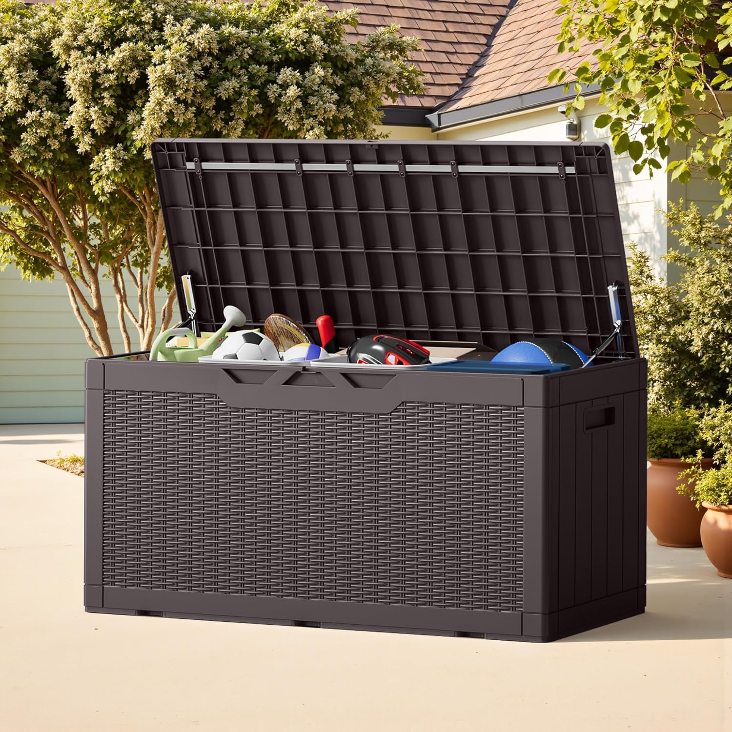 Greesum 100 Gallon Resin Deck Box Lockable Large Outdoor Storage Boxes for Garden Tools, Patio Furniture Cushions, Pool Supplies, Dark Brown