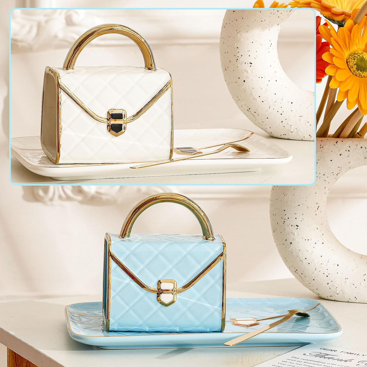 Zubebe 2 Sets Coffee Mug Elegant Handbag Shaped Cup Modern Ceramic Purse Mug with Spoon and Saucer, 10oz Cute Creative Tea Cup for Office Home Woman Girls Gift (White,Blue)