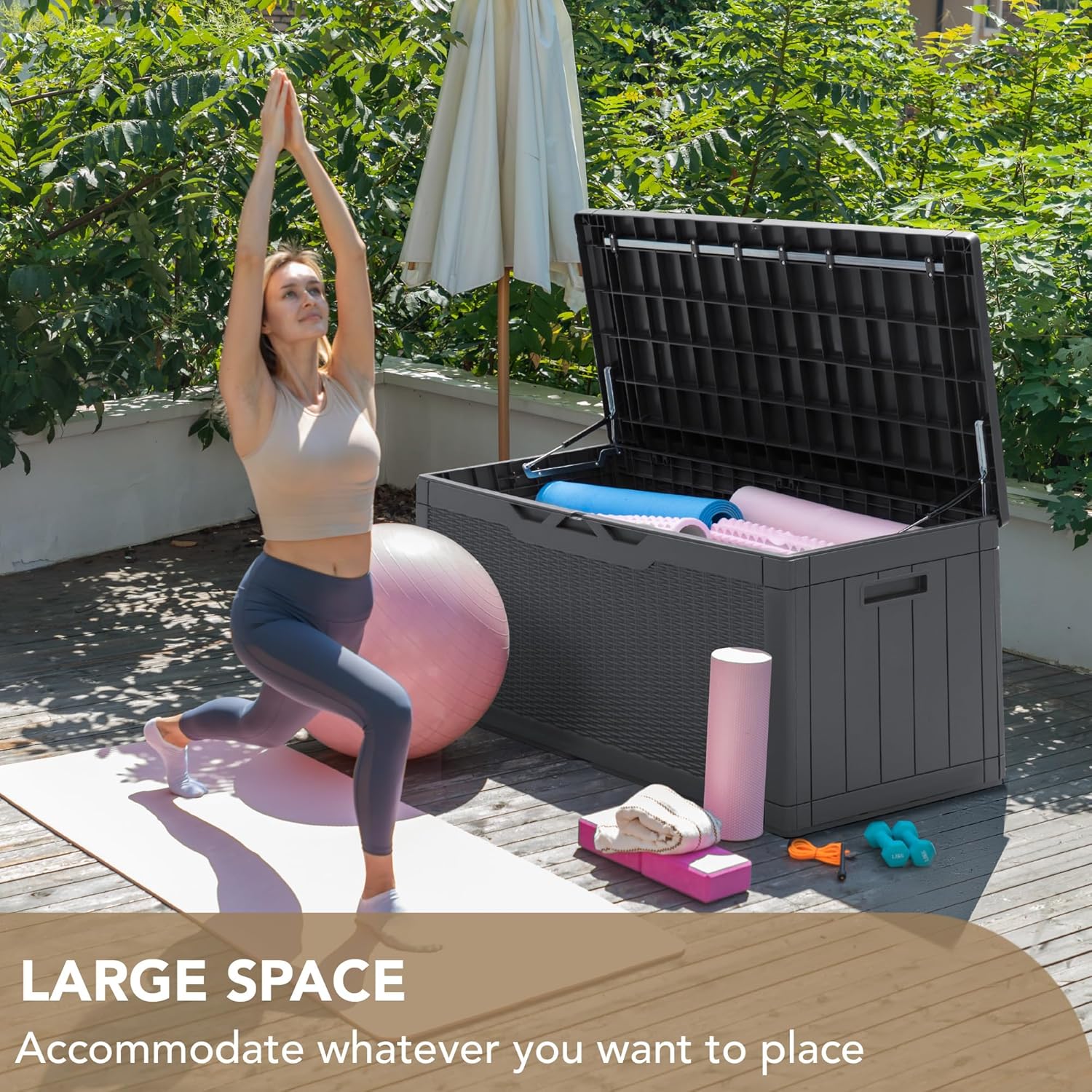 • Durable Resin Material: Deck box is made of waterproof resin, with a complementing rattan pattern design, effectively preventing fading and rusting, while also maintaining a fresh appearance even with all-weather use