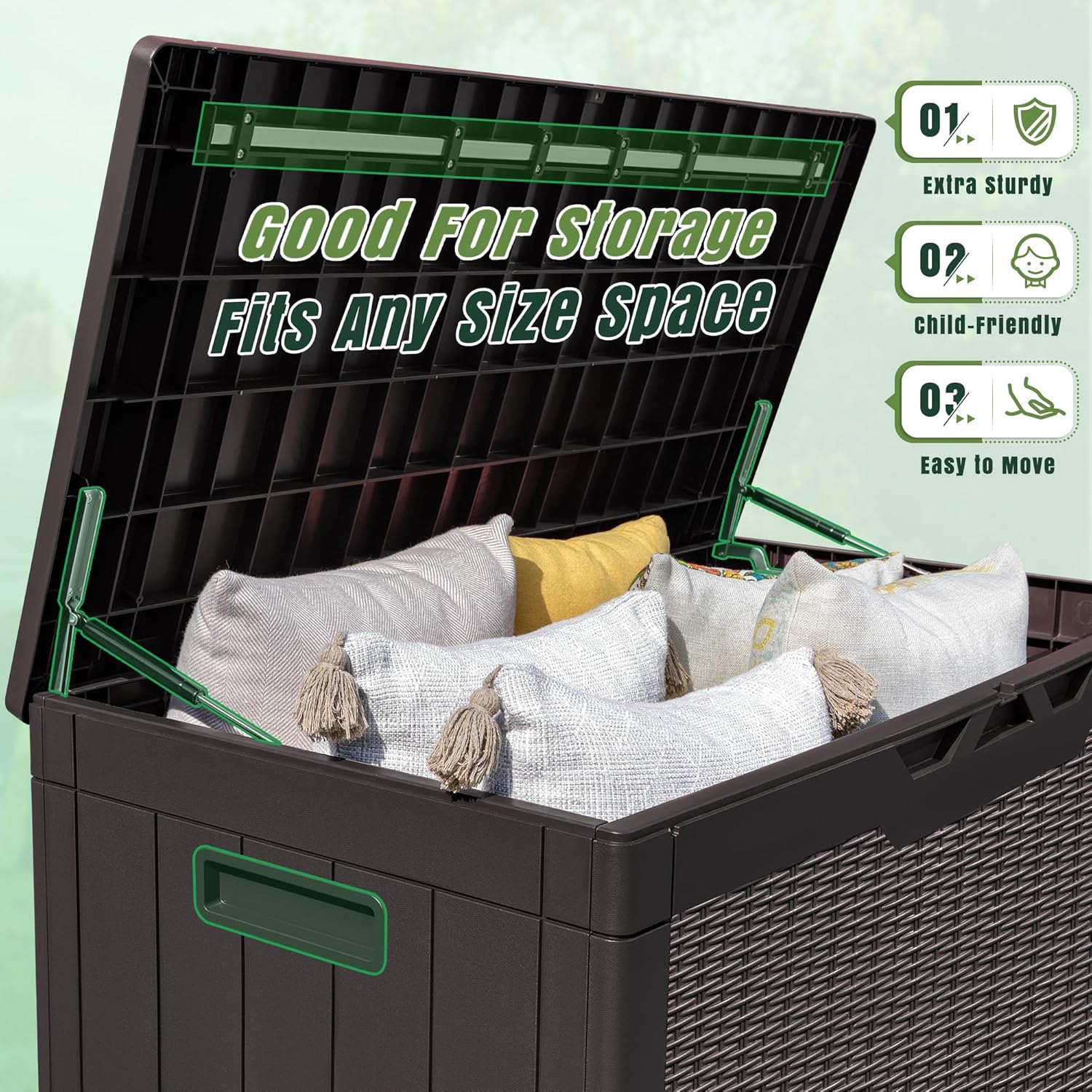 • PRACTICAL DESIGN: The deck box has a hydraulic holder design, which can prevent your hand from being caught when you open and close the box to ensure safety. Meanwhile, there is a support bar designed inside the lid, which can enhance the durability of the storage box.
