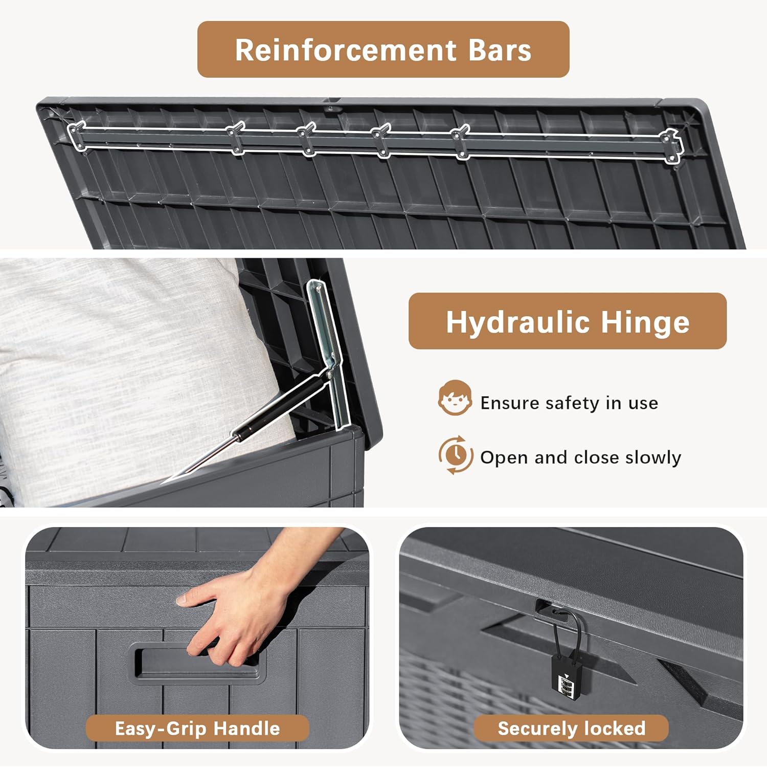 • Resistant Resin Material: Deck box is made of waterproof resin, with a complementing rattan pattern design, effectively preventing fading and rusting, while also maintaining a fresh appearance even with all-weather use