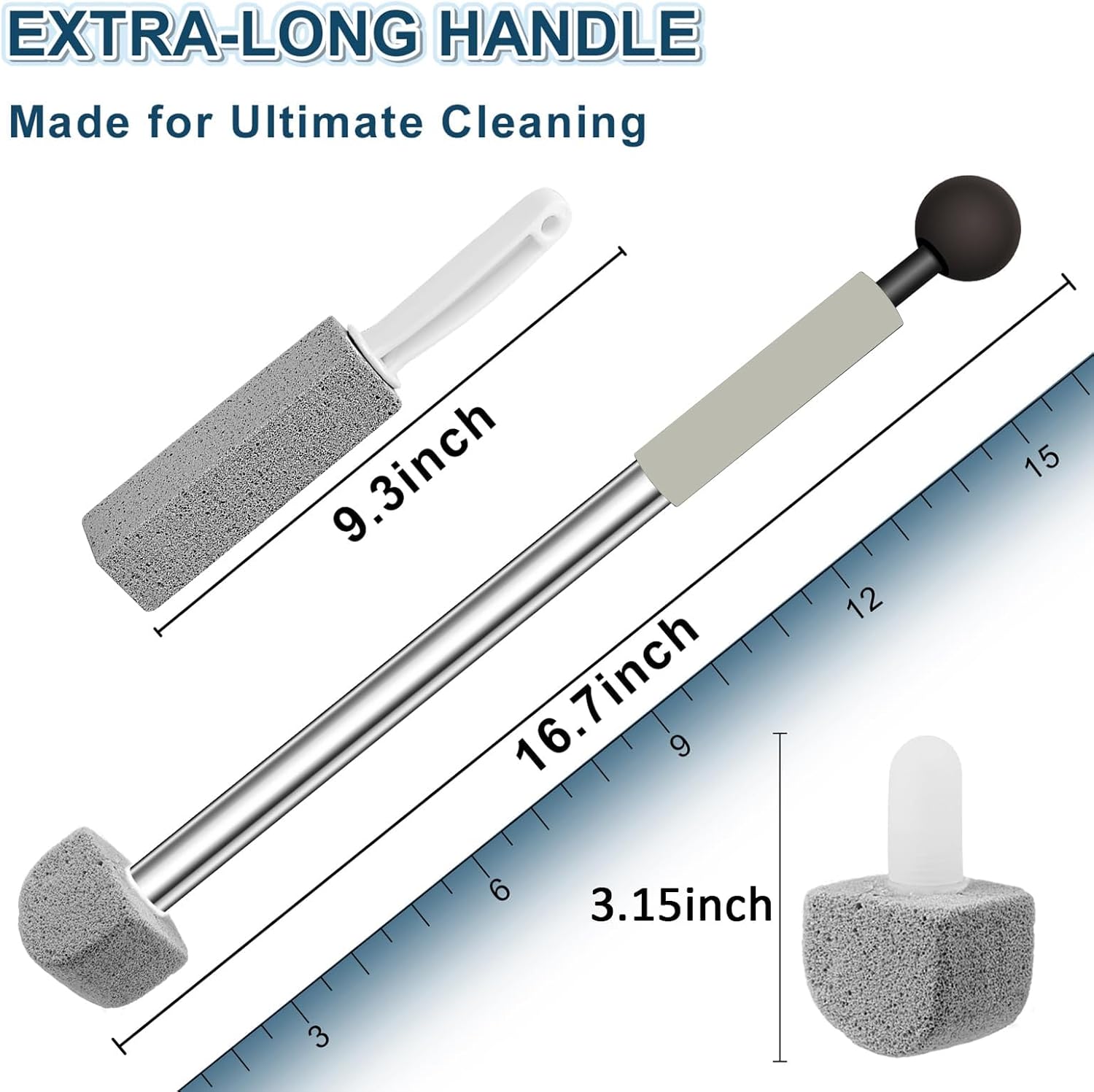 • [Extra Long Handle/Larger Size Pumice Stone]---NEW VERSION Pumice stone toilet bowl brush the size:16.71*1.77*1.6inch/42.5*4.5*4.2cm.Pumice sticks for cleaning is an easy-to-use cleaning tool that is designed to help remove clr calcium,lime&rust remover and hard water stain remover.It's a good toilet scrubber tool for everyone daily needs.