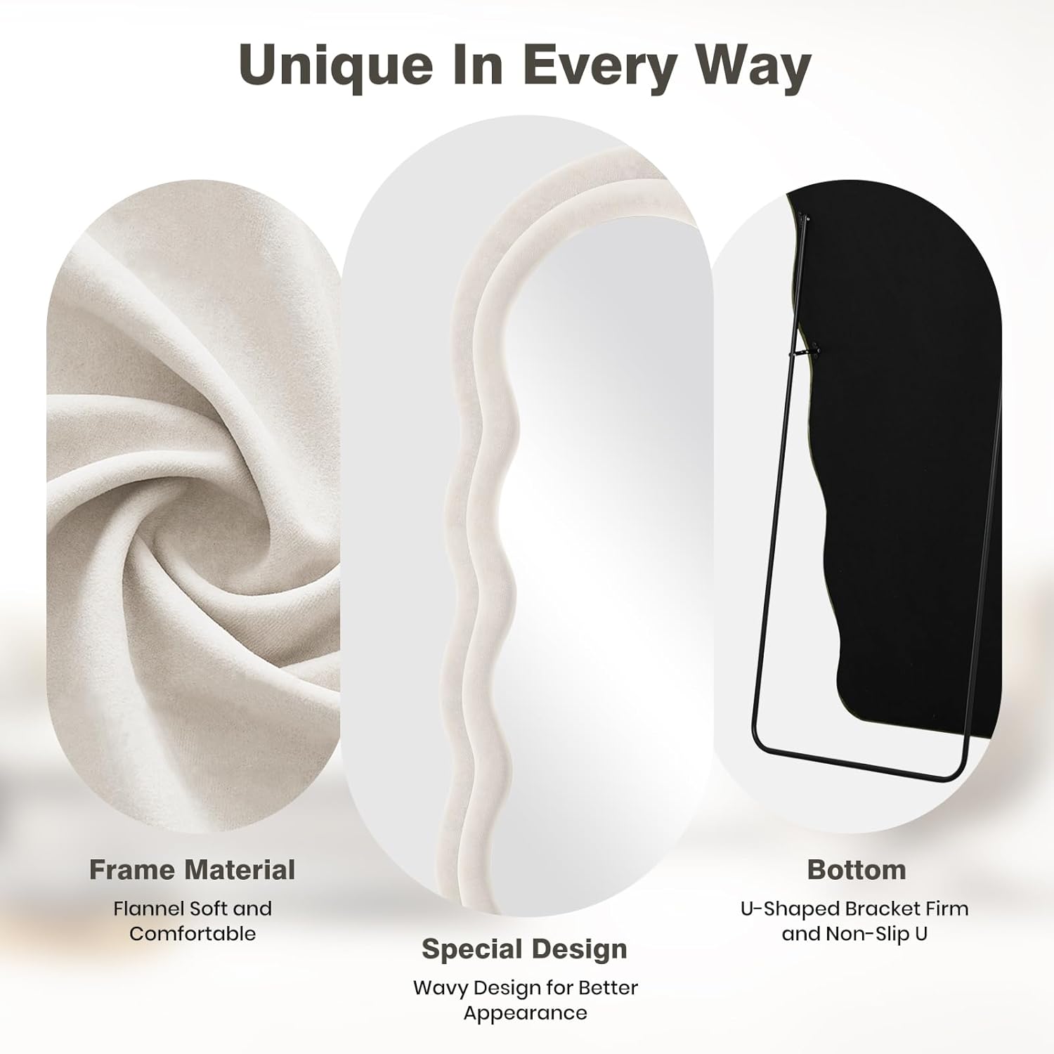 Full Length Mirror 63"x24" Arched Wavy Full Body Wall Mounted Floor Mirror with Stand Ivory Flannel Frame Leaning Hanging Wall Mirror for Bedroom Entrance