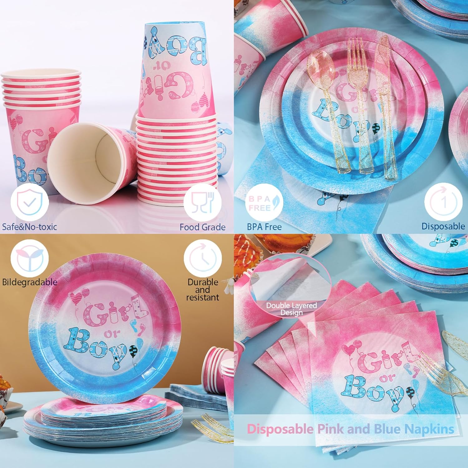 168Pcs Gender Reveal Plates and Napkins Party Supplies, Pink and Blue Plates for Gender Reveal Serves 24, Team Boy or Girl Gender Reveal Ideas, He or She Baby Reveal Decorations