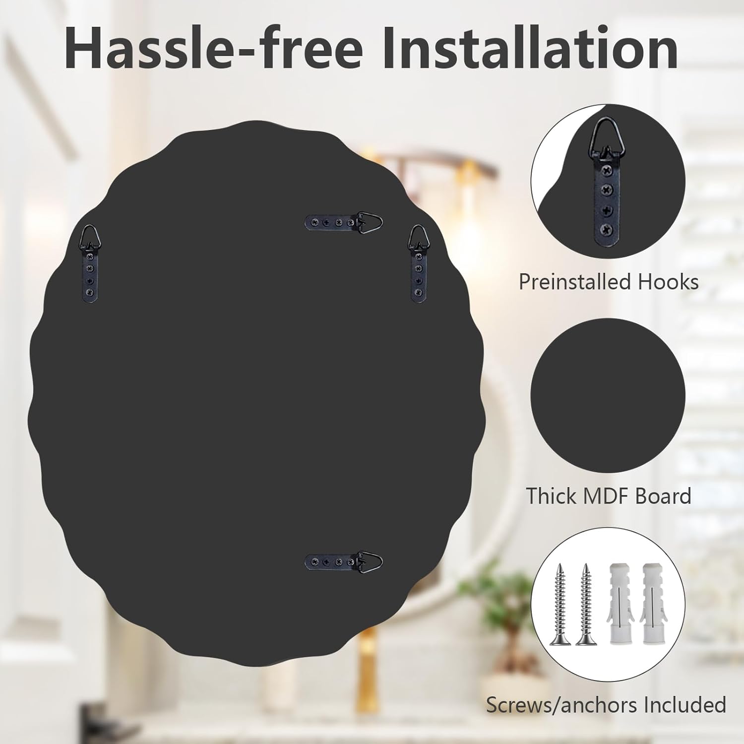 • 【Easy Installation】All mounting hardware are included. The thick MDF backboard is sturdy enough to support the weight of this oval bathroom mirror, with 4 pre-installed hooks on it, you can easily complete the installation within minutes. Support for both horizontal and vertical hanging.