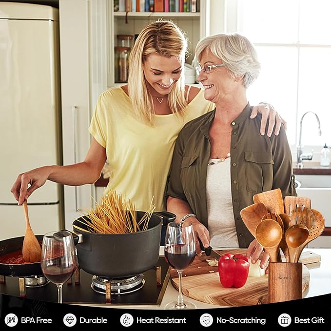 • Wooden Utensil Holder: Our wooden spoon comes with a Wooden Utensil Holder, a unique feature that sets it apart from other products on the market. The holder even has a leak hole at the bottom to prevent water accumulation