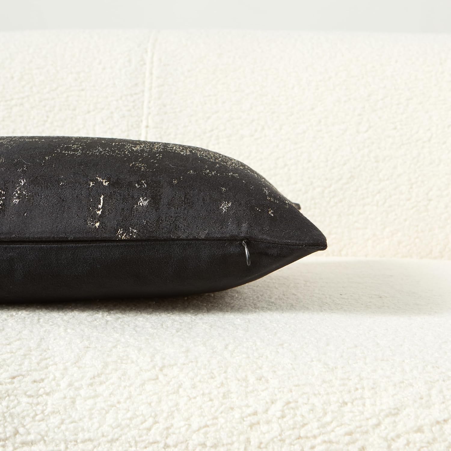 • Premium Jacquard & Velvet Pillow Cover : Crafted with luxe 70% polyester 30% viscose jacquard weave in Black & Gold - featuring elegant gold metallic threads woven through rich black fabric for a soft glowing contrast. The reverse features 100% polyester cream beige velvet in sumptuous cloud-soft texture. Two looks in one - Perfect for Luxury minimalist interiors seeking refined accents.