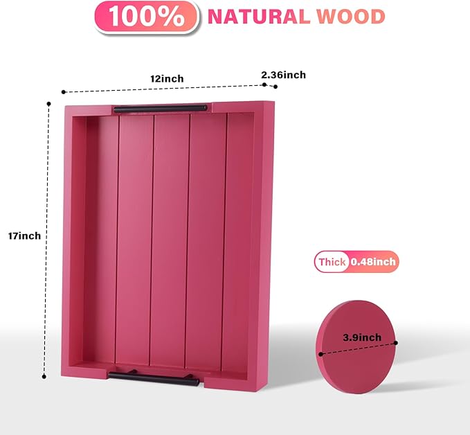 • BEAUTIFUL HANDCRAFTED DESIGN – Carefully crafted from premium quality fir wood with fine attention to details, our wooden serving tray set or tray for ottoman coffee table has ergonomically fitted metal handles for ease of carrying. Measuring 17”x 13”, this wood serving tray (rectangle) is the ideal size to carry snacks, drinks, and meals around the house without any hassle - WONDERFUL home decor!