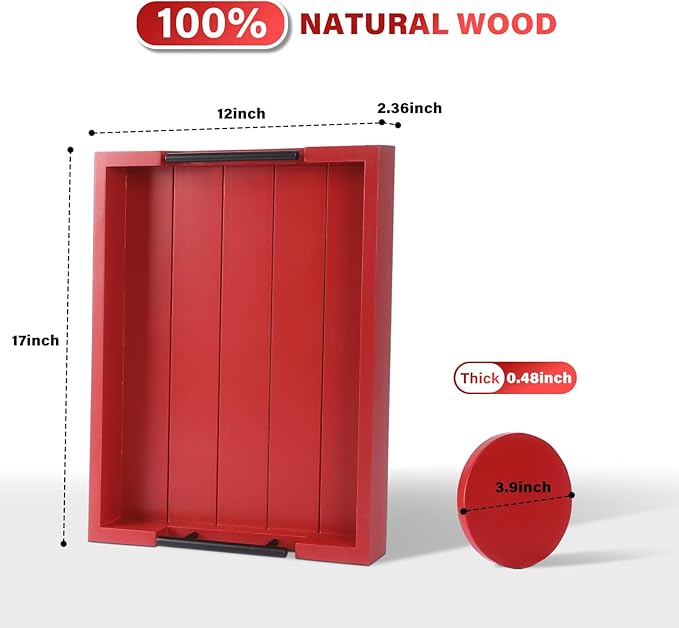 • BEAUTIFUL HANDCRAFTED DESIGN – Carefully crafted from premium quality fir wood with fine attention to details, our wooden serving tray set or tray for ottoman coffee table has ergonomically fitted metal handles for ease of carrying. Measuring 17”x 13”, this wood serving tray (rectangle) is the ideal size to carry snacks, drinks, and meals around the house without any hassle - WONDERFUL home decor!